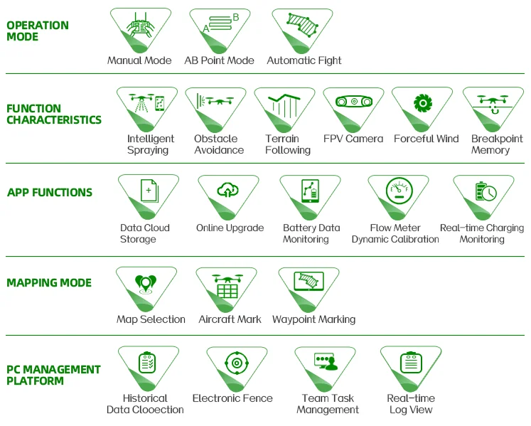 High Efficiency: One drone can cover 50~70 hectares field per day. Compared with plane, tractor and hand-held sprayers, drone sprayer is more efficient, reduce water & pesticides use, has less drift, keeps people away from heat-stroke and chemical poisoning.