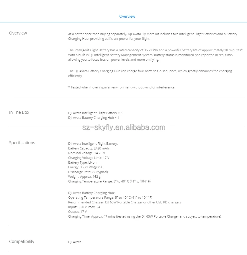 Cost-efficient, includes two Intelligent Flight Batteries and a Battery Charging Hub to provide sufficient power for your flights. Overview At a better price than buying separately, DJI Avata Fly More Kit includes two Intelligent Flight Batteries and a Battery Charging Hub, providing sufficient power for your flight. The Intelligent Flight Battery has a rated capacity of 35.71 Wh and a powerful battery life of approximately 18 minutes*. With a built-in DJI Intelligent Battery Management System, battery status is monitored and reported in real-time, allowing you to focus less on power levels and more on flying. The DJI Avata Battery Charging Hub can charge four batteries in sequence, which greatly enhances the charging efficiency. * Tested when hovering in an environment without wind or interference. In The Box DJI Avata Intelligent Flight Battery × 2 DJI Avata Battery Charging Hub × 1 Specifications DJI Avata Intelligent Flight Battery: Battery Capacity: 2420 mAh Nominal Voltage: 14.76 V Charging Voltage Limit: 17 V Battery Type: Li-ion Energy: 35.71 Wh@0.5C Discharge Rate: 7C (typical) Weight: Approx. 162 g Charging Temperature Range: 5° to 40° C (41° to 104° F) DJI Avata Battery Charging Hub: Operating Temperature Range: 5° to 40° C (41° to 104° F) Recommended Charger: DJI 65W Portable Charger or other USB PD chargers Input: 5-20 V, max 5 A Output: 17 V Charging Time: Approx. 47 mins (tested using the DJI 65W Portable Charger and subject to temperature) Compatibility DJI Avata