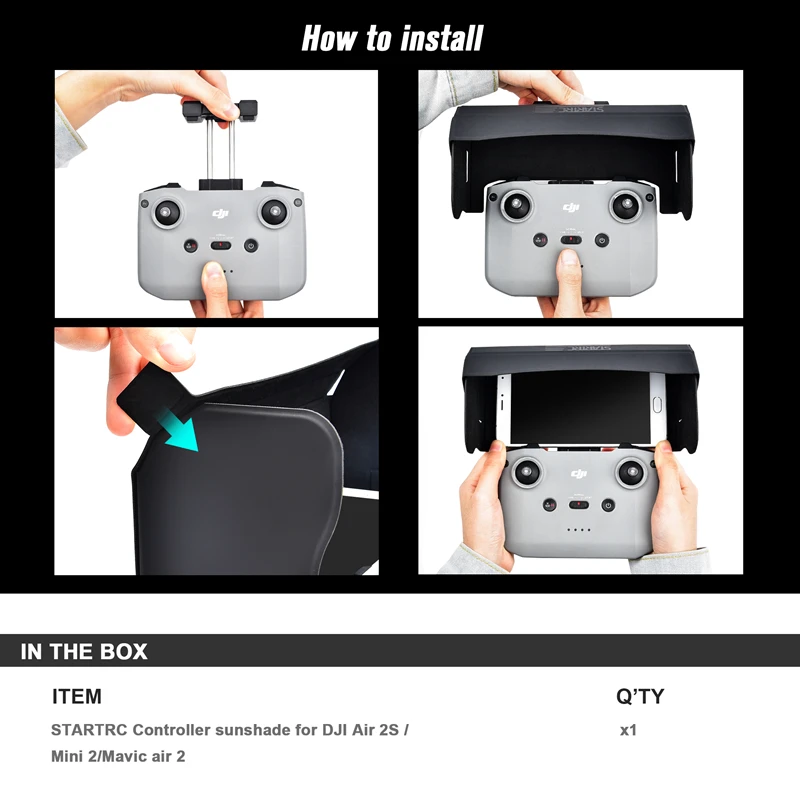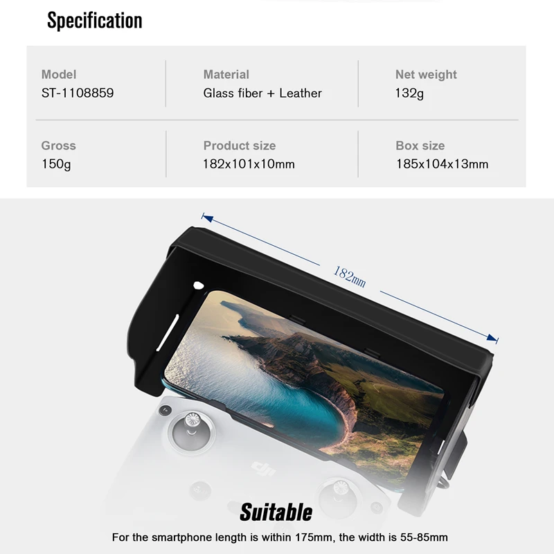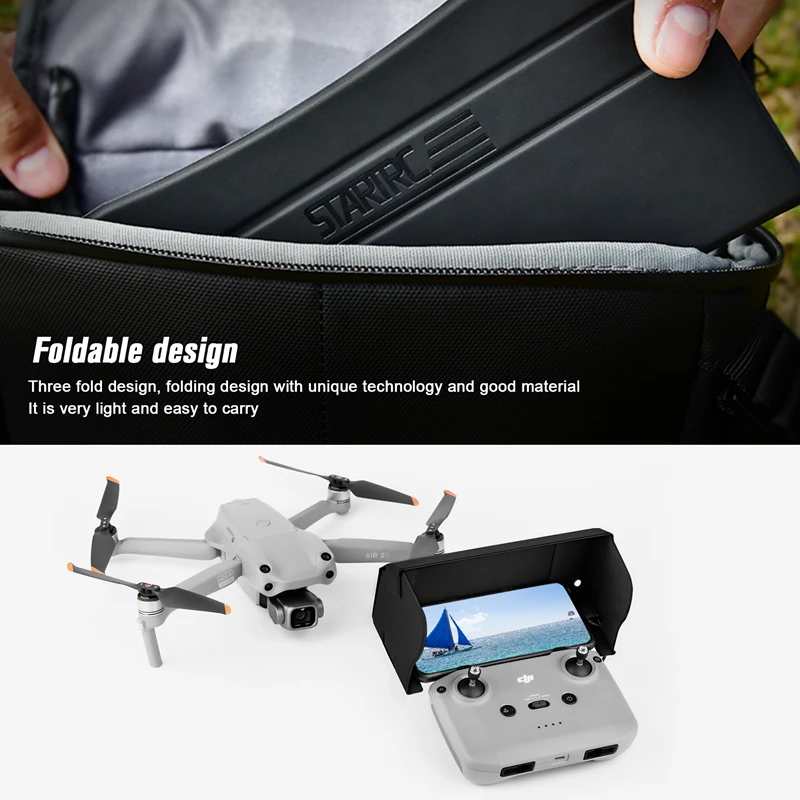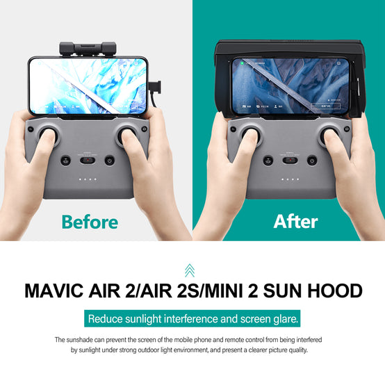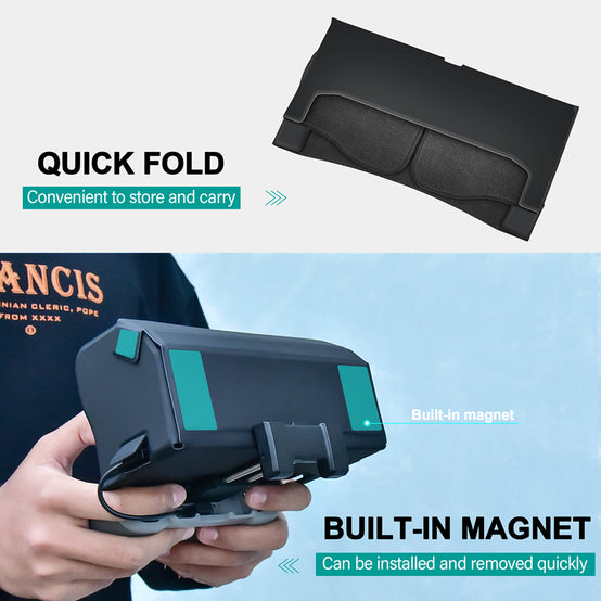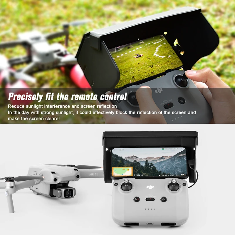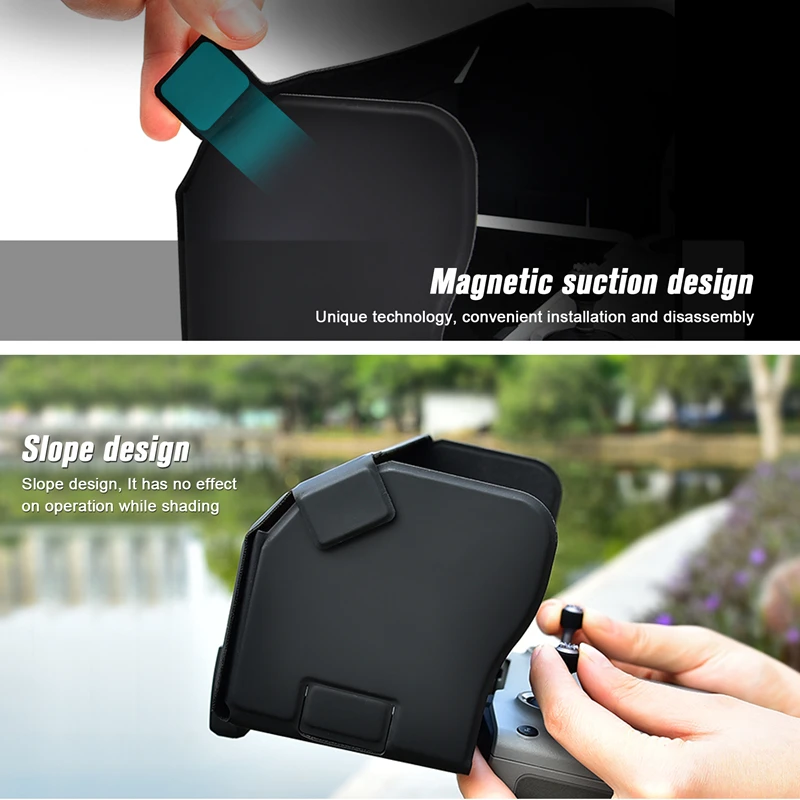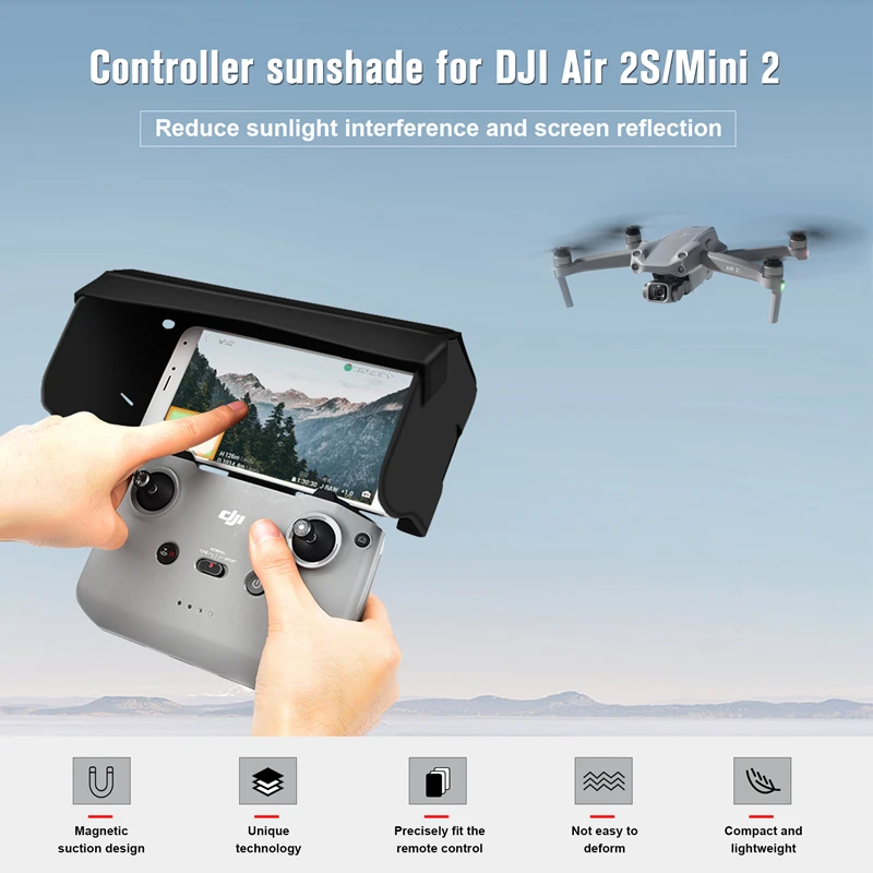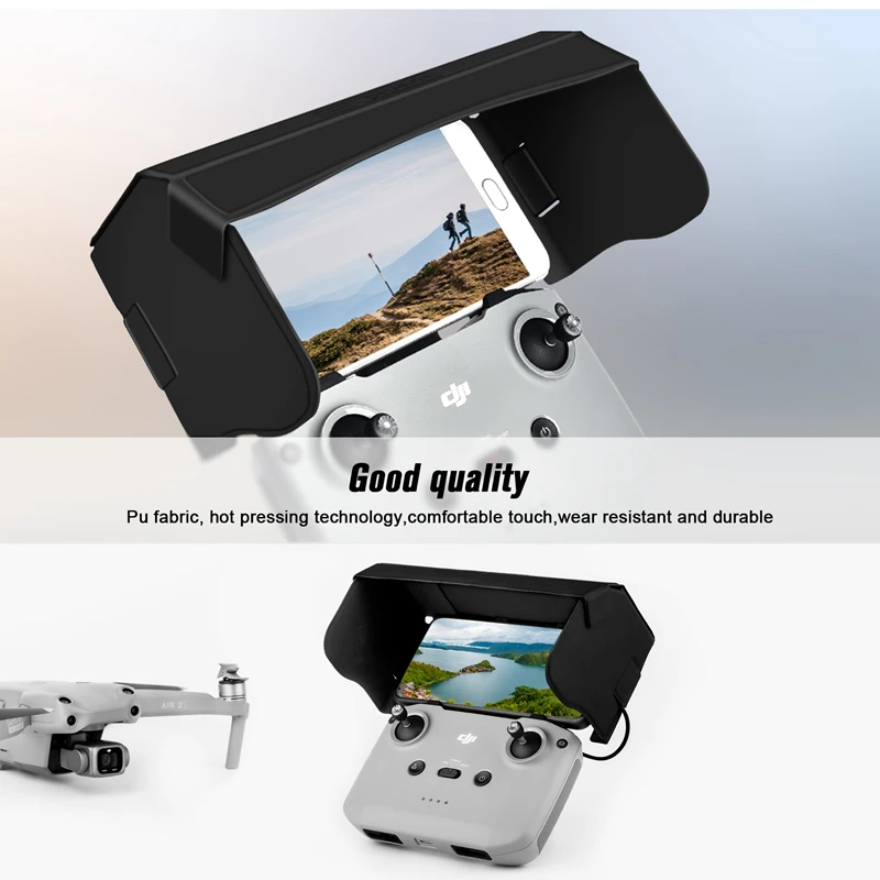 【Compatible】: The controller monitor hood is suitable for DJI Air 2S/Mavic Air 2/Mini 2 controller 【Visual protection】: The controller sunhood effectively prevent the screen from being unable to see clearly when using the remote control in a strong light environment and protects vision. The special shape of controller monitor hood could better block direct sunlight without compromising the line of sight 【Special design】: The controller monitor hood have a magnetic foldable design that is comfortable to wear and does not cause any stress, and there is a hole for the data cable at the side of the controller monitor hood that ensures the clear transmission of the images and is more convenient to use. The surface of the controller monitor hood is made of high quality PU leather, smooth and comfortable, and durable. Won't scratch your remote and cell phones. 【Portable Size】: This controller monitor hood is compatible with 12-18 cm (4.4-7.1 inch smartphone screen) large smartphone . The controller monitor hood size is compatible with most mobile phone sizes on the market.You could put it on your storage bag,or storage case 【Non-destructive installation】: The controller monitor hood is magnetic design,it is the non-destructive installation and easy to install,does not harm the mobile phone and remote control. Specifications: net weight: 132g gross weight: 150g product size: 182x101x10mm box size: 185x104x13mm 【1】Precisely fit the remote control Reduce sunlight interference and screen reflection In the day with strong sunlight, it could effectively block the reflection of the screen and make the screen clearer 【2】Suitable For the smartphone length is within 175mm, the width is 55-85mm 【3】Magnetic suction design Unique technology, convenient installation and disassembly 【4】Slope design Slope design, It has no effect on operation while shading 【5】Good quality Pu fabric, hot pressing technology,comfortable touch,wear resistant and durable 【6】Foldable design Three fold design, folding design with unique technology and good material It is very light and easy to carry