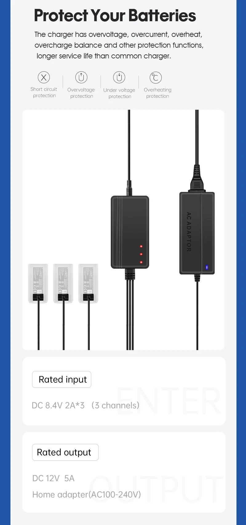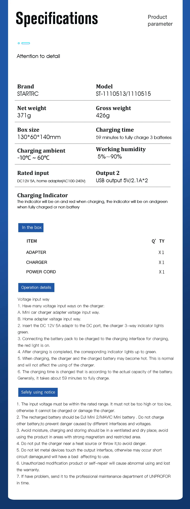 1. Intelligent one drag three, can simultaneously charge three groups of batteries, charging time only about one hour; 2. Built-in short-circuit, overheat, overvoltage, undervoltage four-fold protection arrangement, intelligent charging does not hurt the battery; 3. The charger is connected to the power cord for stable power supply. The line length is 2 meters, and there is no binding anytime and anywhere. 4. The charger can also be used for on-board power access. Model: 1110513/1110515 For: Mini SE /Mini 2 / Mavic Mini battery Net weight: 371g Storage temperature: -10°C~60°C Rated input: DC12V 5A, home adapter (AC100-240V) Rated output: DC8.4V2A* 3 (3 channels) Working temperature : -10°C~60°C Working humidity : 5%~90% Charging time: About 1 hour for 3 pieces batteries at the same time Charging Indicator: The indicator will be on and red when charging, the indicator will be on and green when fully charged or non battery Protection functions: Short circuit protection (SCP), overheating protection (OTP),overvoltage protection (OVP), undervoltage protection (UVLO)