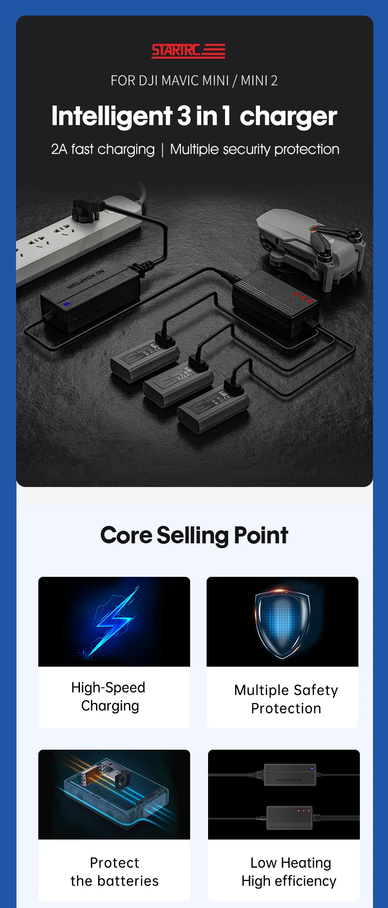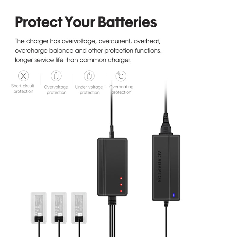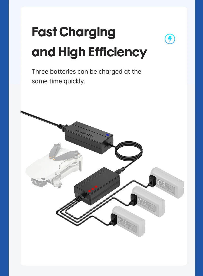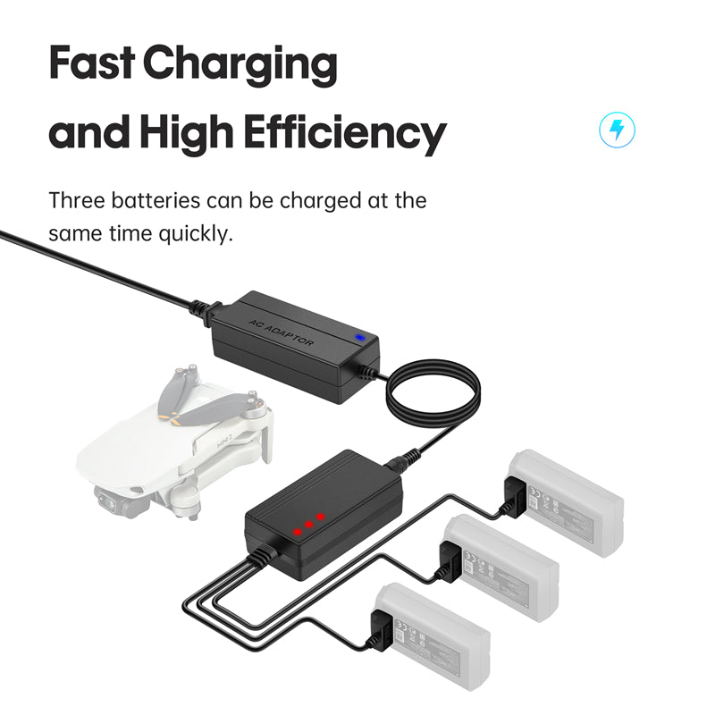 The charger was designed for Mavic Mini/Mini 2 /Mini SE series drone battery specially. Its advantages included rich interfaces, environmental protection, energy saving, light weight, easy to carry and so on. Three batteries can be charged at the same time quickly.
