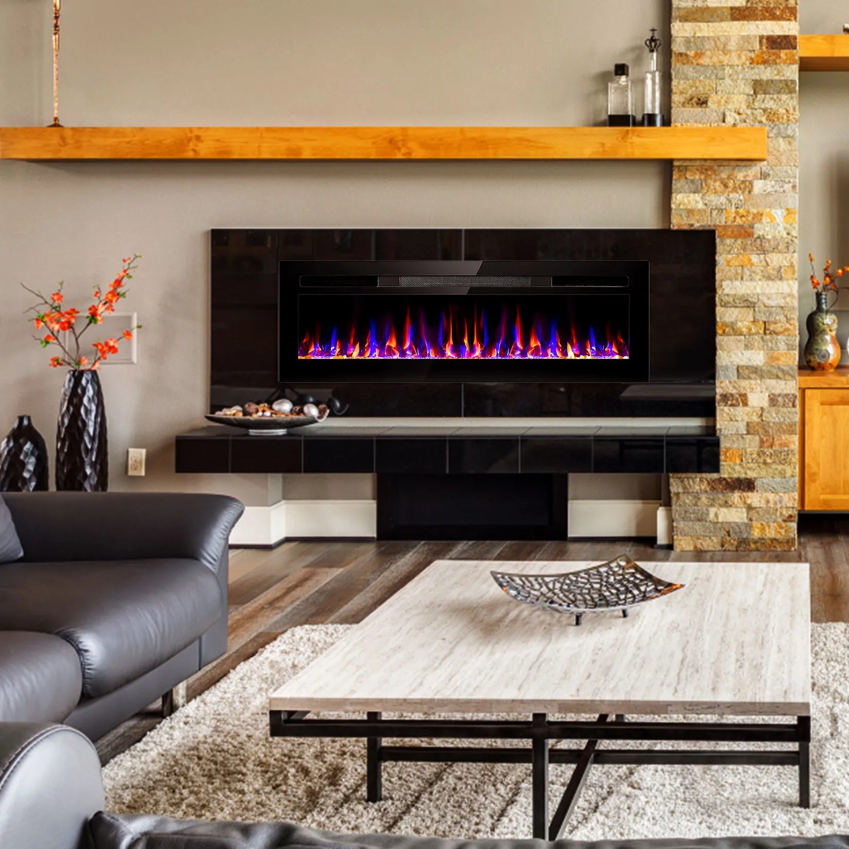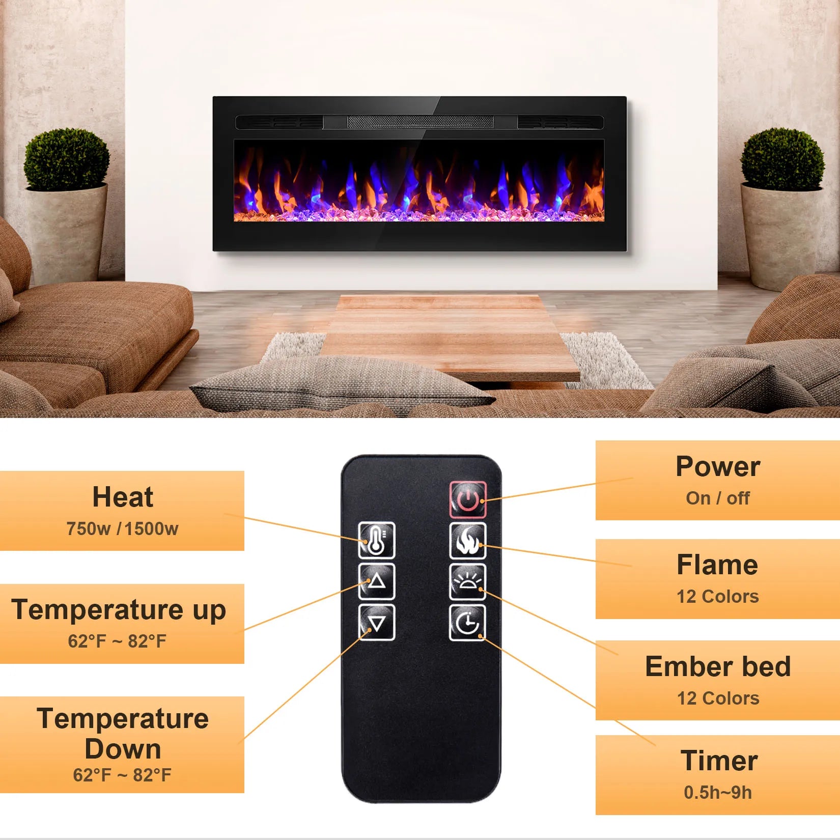 A.[Multi-Function Electric Fireplace]: The Electric Fireplace adopts the latest unibody enclosure and high-quality tempered glass panel design, with full spectrum 12 flame & LED flame bed color modes, 2 flexible control modes, safety and energy saving, low noise, multiple installation method features. It’s a fashion design and high quality multi-function fireplace for living room, bedroom, office, hotel lobby or anywhere you need to add heat and ambience.