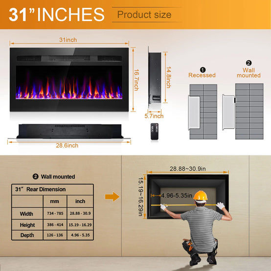 31inch Electric Fireplace Heater with Timer Insert Wall Mounted Adjustable 12 Flame Remote Control 750/1500W Heater Dropship