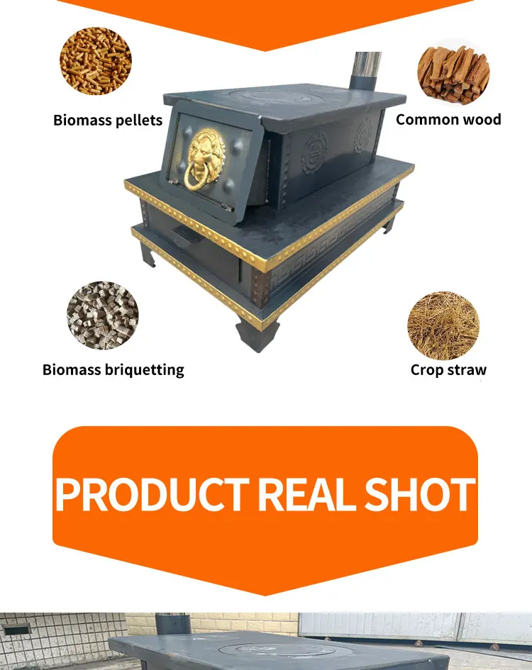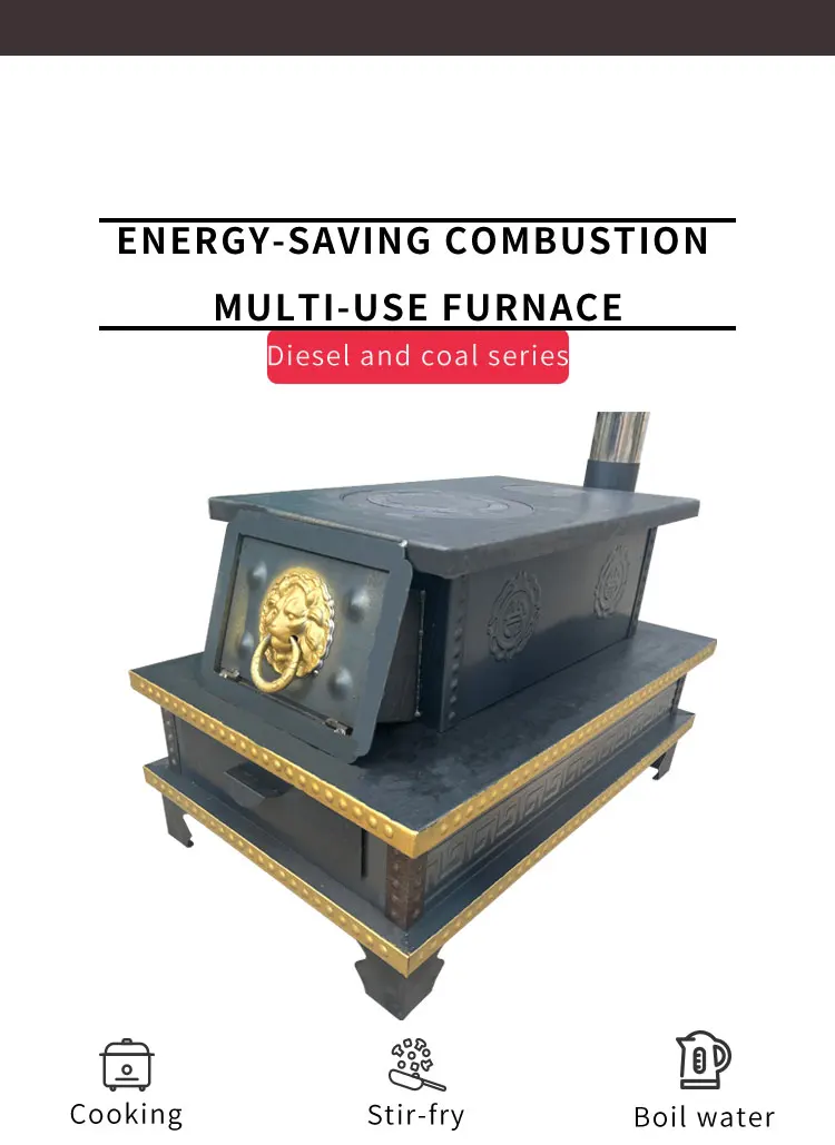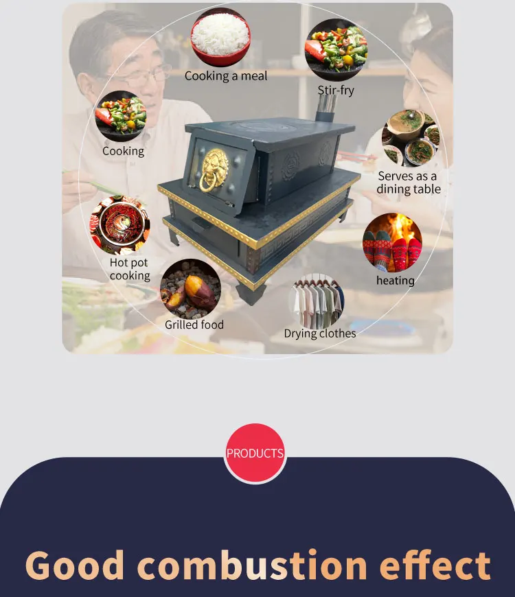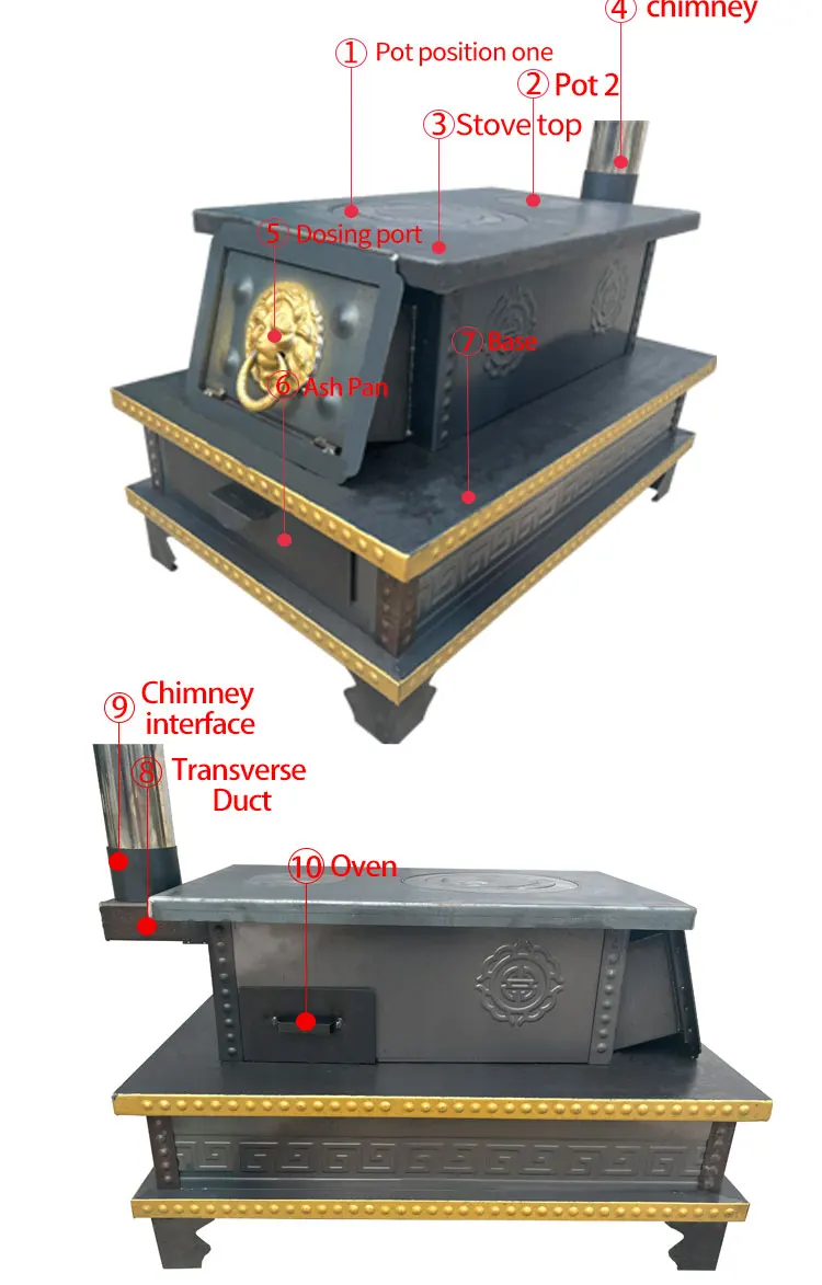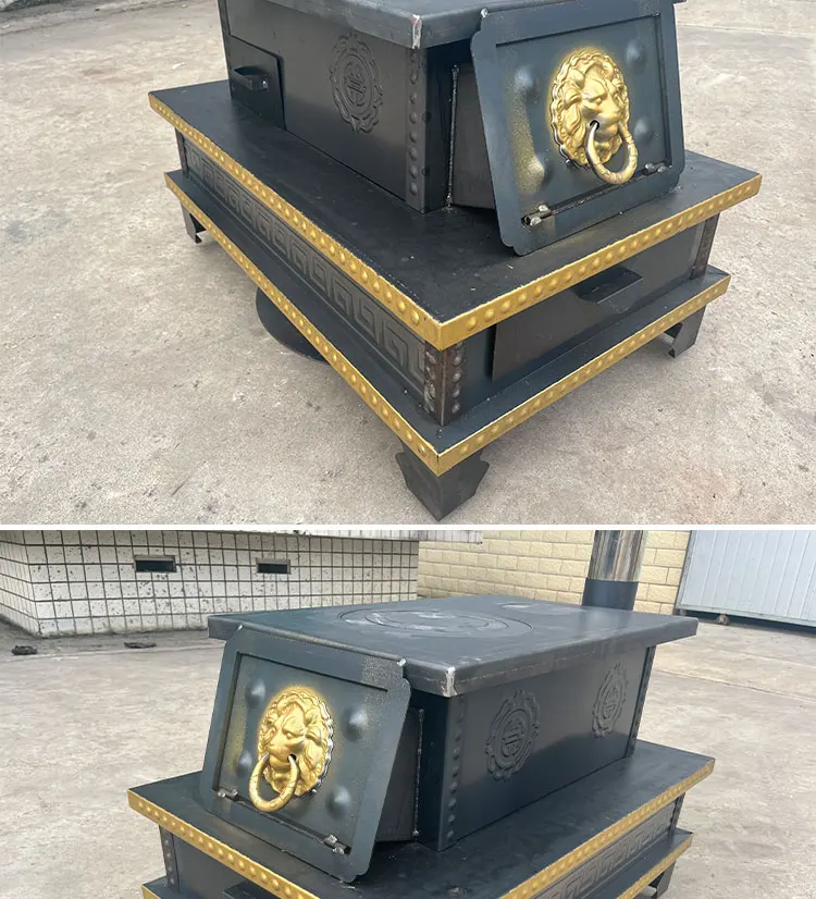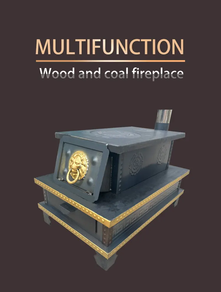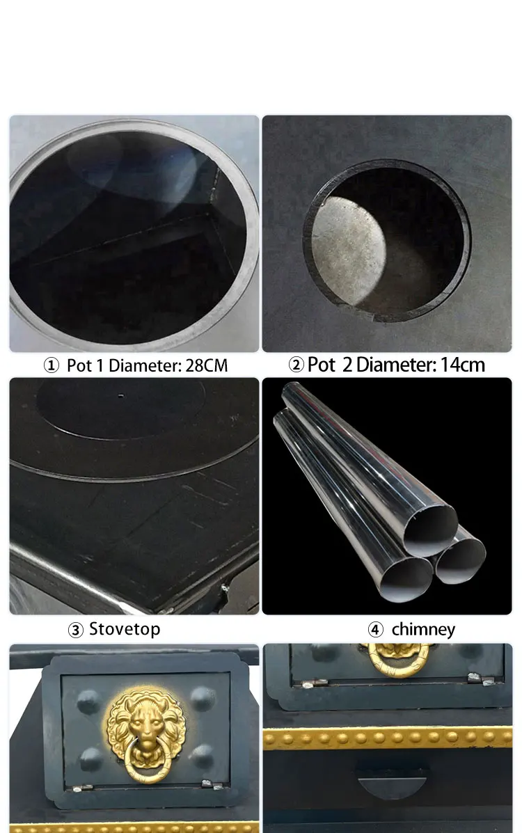 1. Golden lion head furnace door with pull ring, beautiful and domineering 2. The furnace body and furnace bottom are designed with decorative patterns 3. The double-pot design of one main pot and one pair of pots is convenient and practical 4. There is an oven on one side of the furnace body, which can keep food warm and roast sweet potatoes, potatoes, dried fruits, etc. 5. The overall black of the fireplace is matched with the golden color of the edge, and the golden rivets around the bottom of the furnace are mysterious and quiet. 6. The design of this fireplace is beautiful, generous and multi-purpose. 7. If you love food, you can use this fireplace to keep warm and show many food skills in winter 8. Heating area: 20-50 square meters (theoretical value), the actual heating area depends on the house structure and thermal performance.