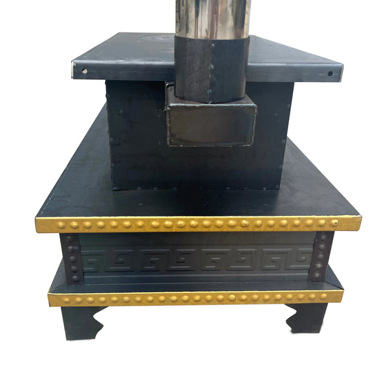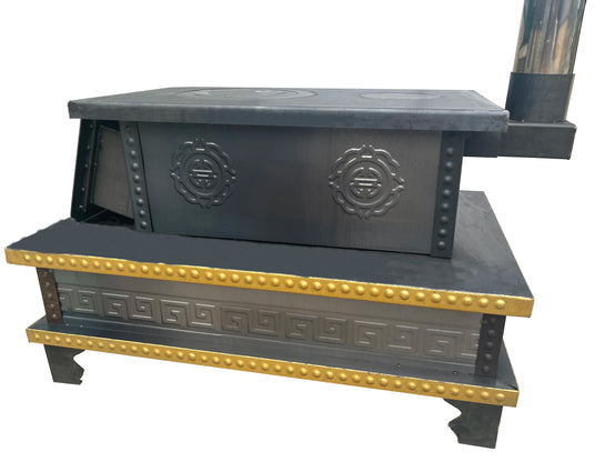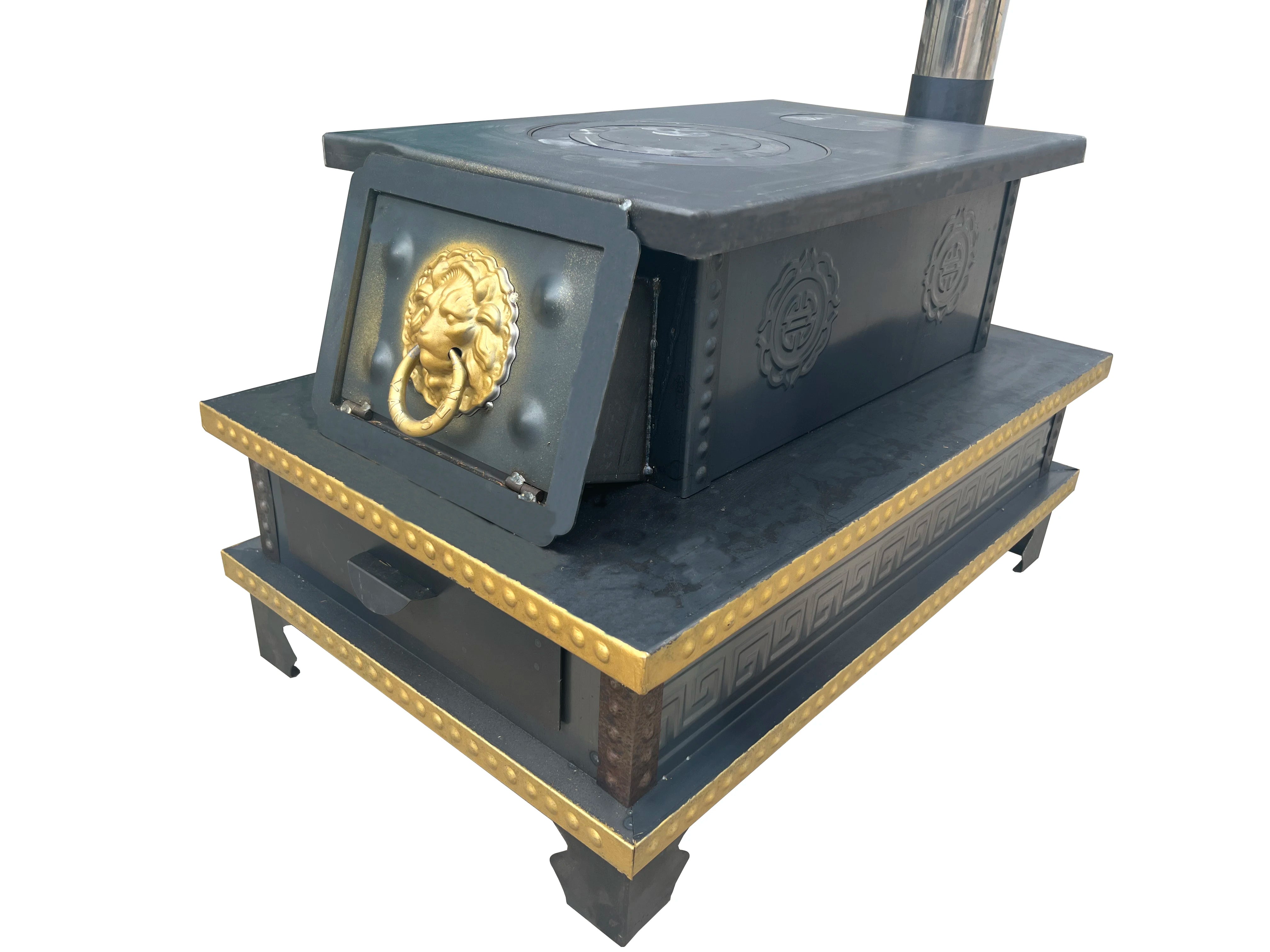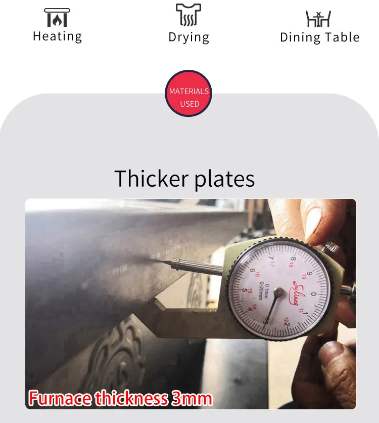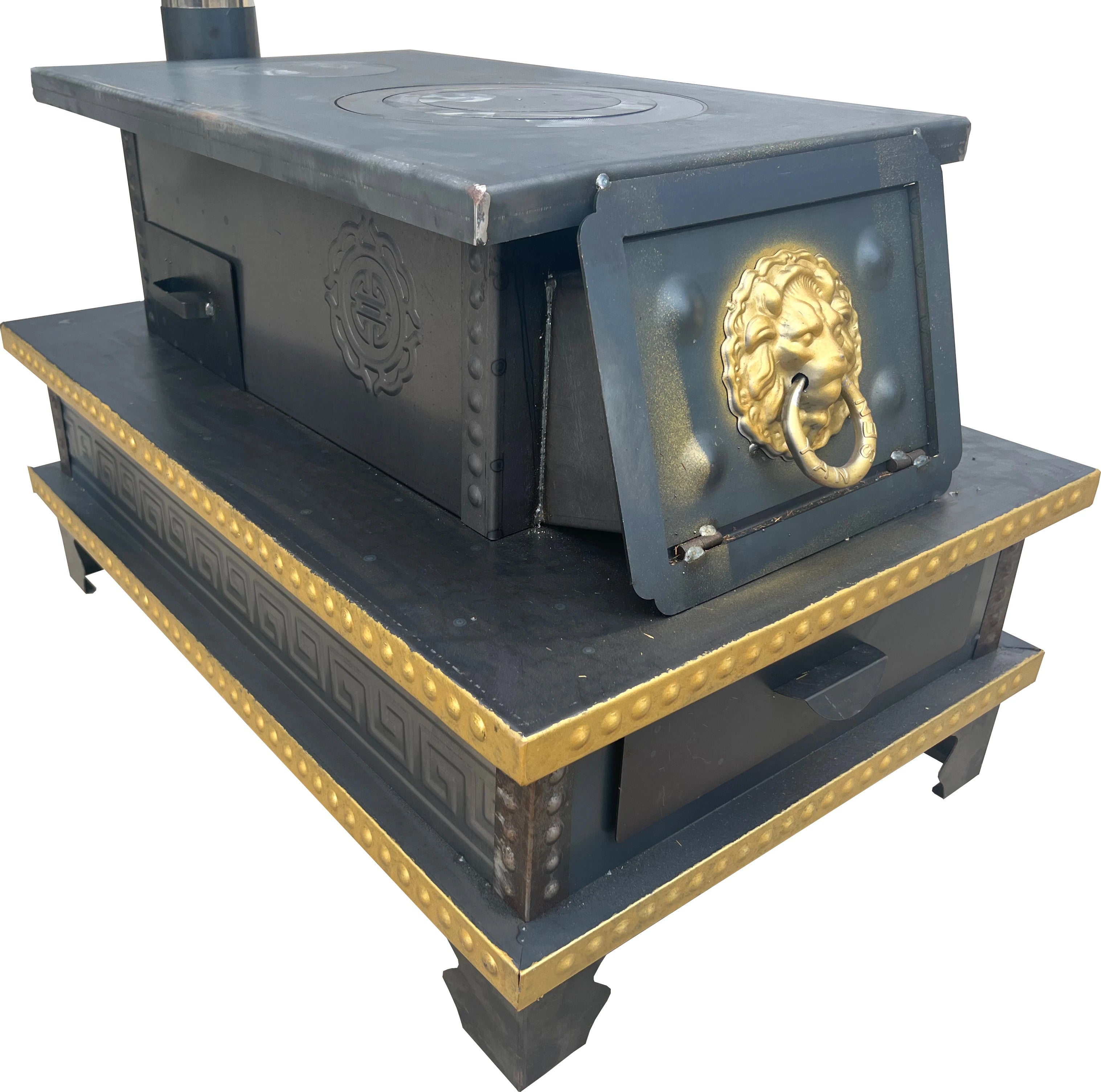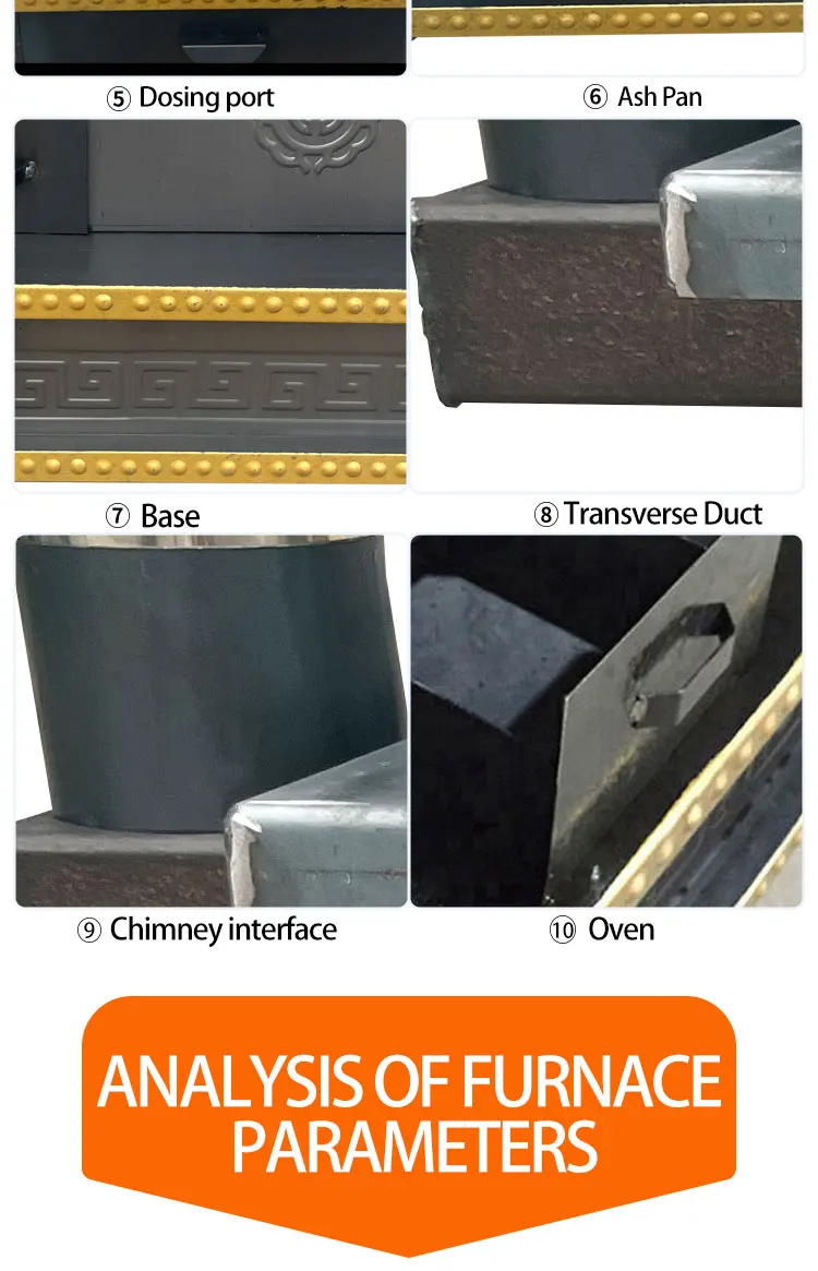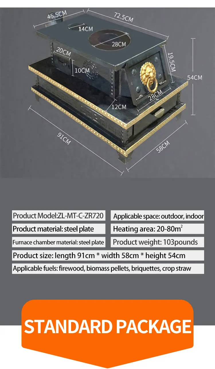 1. Golden lion head furnace door with pull ring, beautiful and domineering 2. The furnace body and furnace bottom are designed with decorative patterns 3. The double-pot design of one main pot and one pair of pots is convenient and practical 4. There is an oven on one side of the furnace body, which can keep food warm and roast sweet potatoes, potatoes, dried fruits, etc. 5. The overall black of the fireplace is matched with the golden color of the edge, and the golden rivets around the bottom of the furnace are mysterious and quiet. 6. The design of this fireplace is beautiful, generous and multi-purpose. 7. If you love food, you can use this fireplace to keep warm and show many food skills in winter 8. Heating area: 20-50 square meters (theoretical value), the actual heating area depends on the house structure and thermal performance.