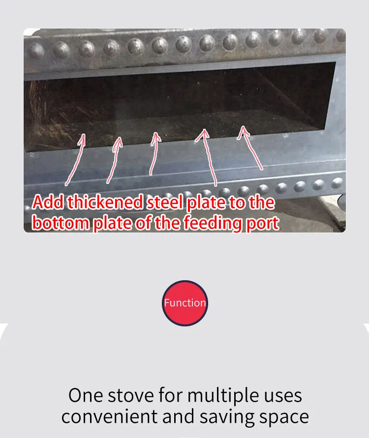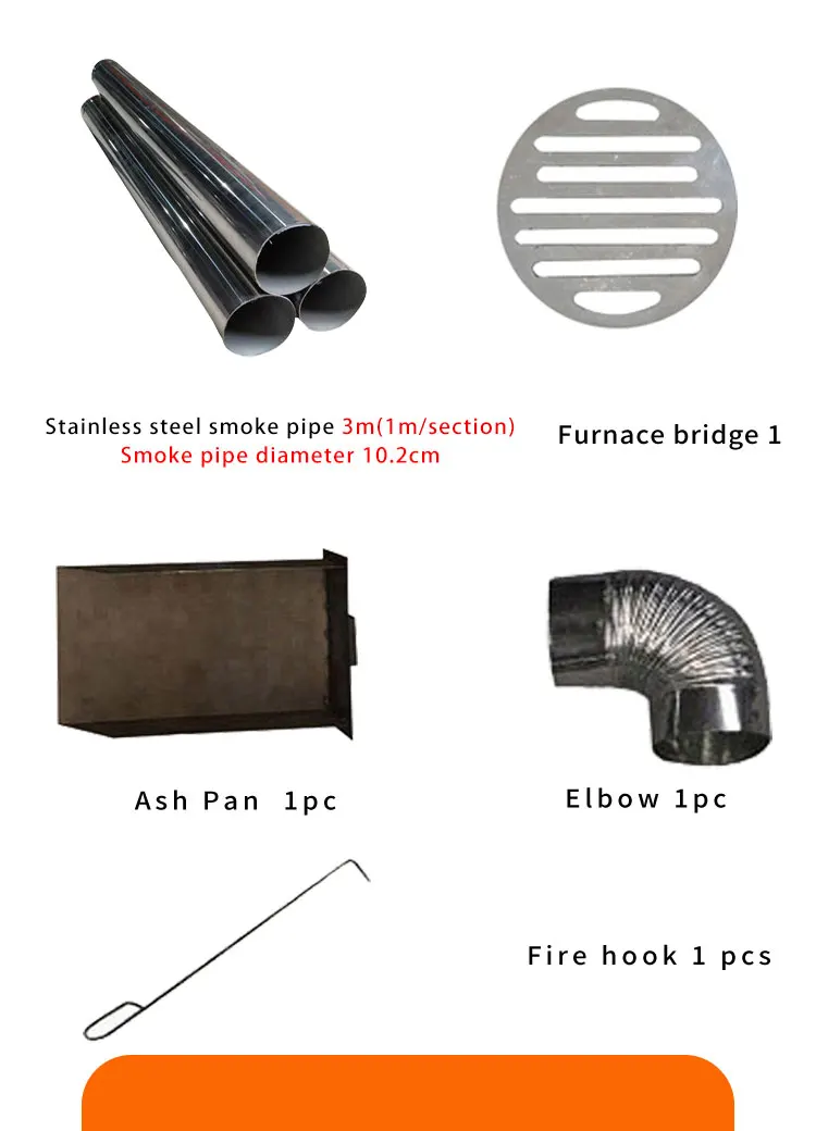 Furnace length, width and height: 905mm×630mm×500mm, Stainless steel chimney: diameter 102mm The main pot is 11 inches in diameter, the auxiliary pot is 5.5 inches in diameter, Oven: 7.8 inches long * 3.9 inches wide * 9.8 inches deep Feed port depth: 18 inches