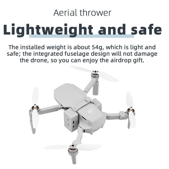 1. Suitable for DJI MINI 2/MAVIC MINI drones, can be delivered remotely, used for advertising, throwing bait, throwing gifts, delivering meals, sending wedding rings, etc.;