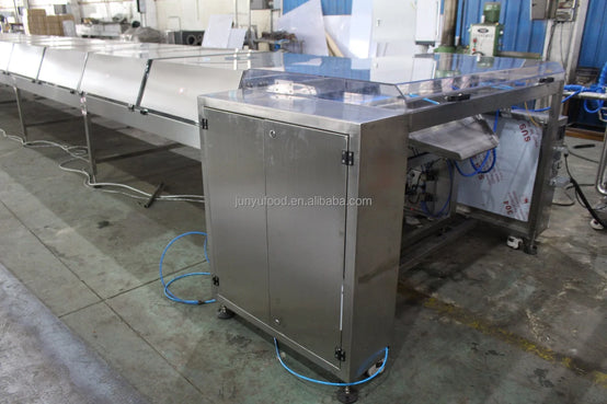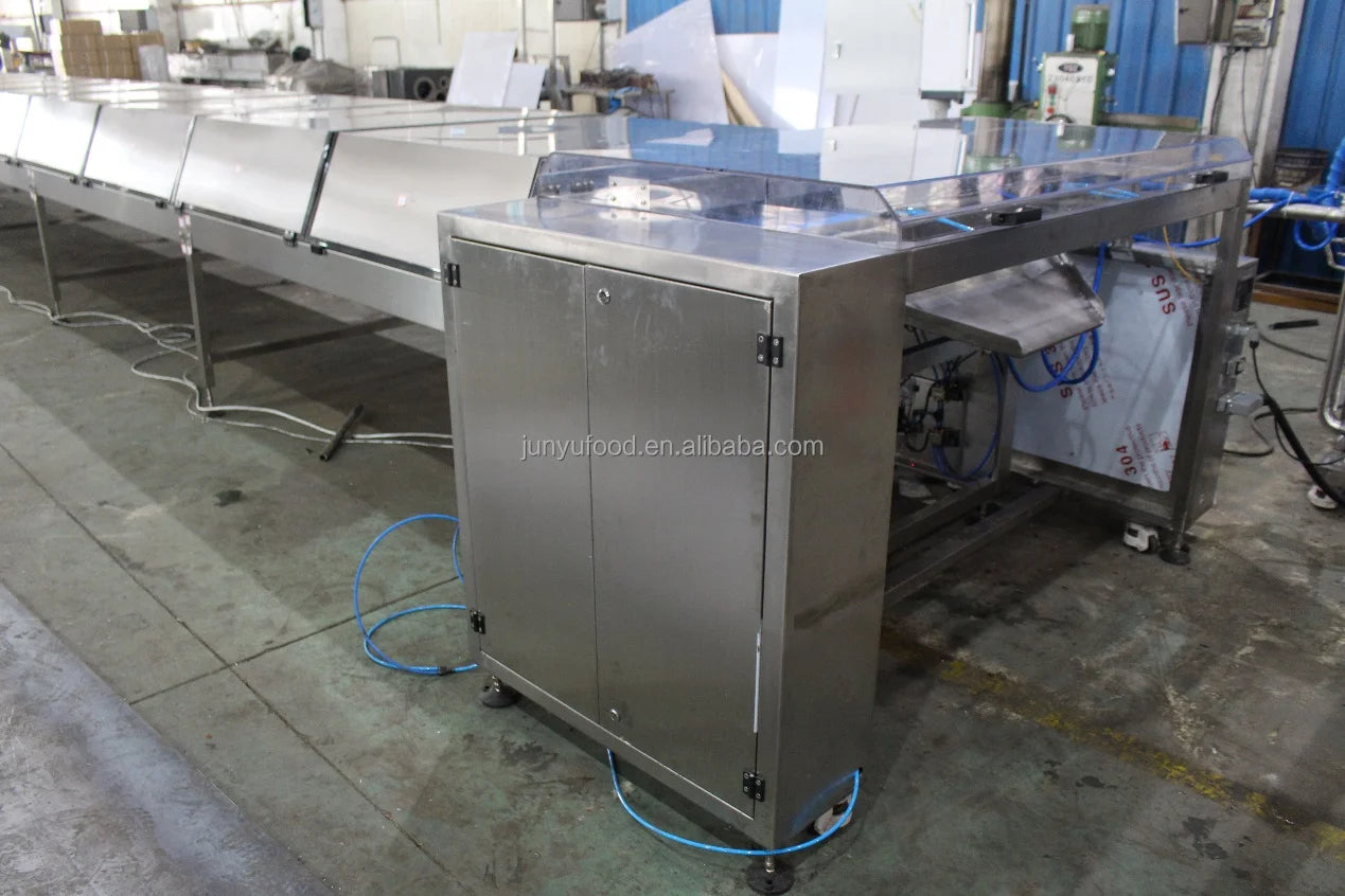 This machine is a specialized equipment for chocolate moulding with electric control system. The producing process icludes moulds-baking,depositing,vibration,cooling,de-moulding,conveying etc.,full-automatic working procedure.This machine is available to produce pure chocolate,filled chocolate,double-color chocolate and granule mixing chocolate etc.with smooth,beautiful surface.Weighting accurately,it is an ideal equipment to producing high-quality chocolate.