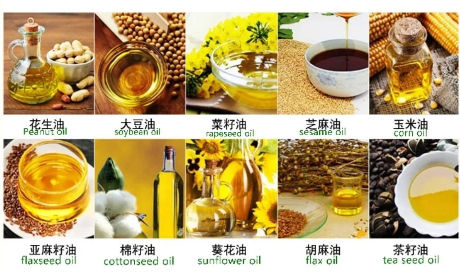 rapeseed, flax, tea seed, sesame, olive, walnut kernel, corn germ, rice bran, tea seed, safflower seed, sea buckthorn seed, neem