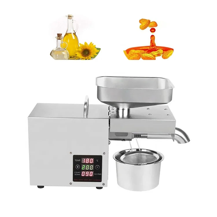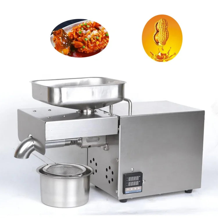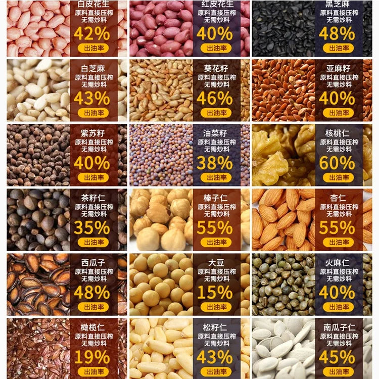 This oil press with cold and hot pressing function,fit for more than 18 kinds of materials:such as Peanuts,sesame,walnut,rapeseed,sunflower,soybeans,castor beans,pumpkin seeds,pine nuts,hazelnut kernels,almonds.