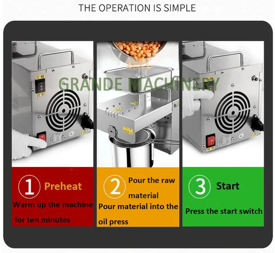---High-quality machine housing, made of stainless steel ---Large-caliber unloading port, convenient for unloading, no jam or blockage ---Autonomous oil press ---Green, healthy and environmentally friendly ---Food-grade stainless steel, spiral design to ensure smooth oil output ---The operation panel is simple and easy to operate ---Double cooling and exhaust system which can work continuously ---Pure copper motor