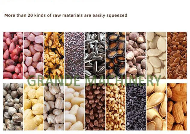 Suitable for squeezing a variety of materials, such as peanuts, sesame seeds, walnuts, castor beans, melon seeds, pumpkin seeds, moringa seeds, flax seeds, almonds, black sesame seeds, perilla seeds, etc.