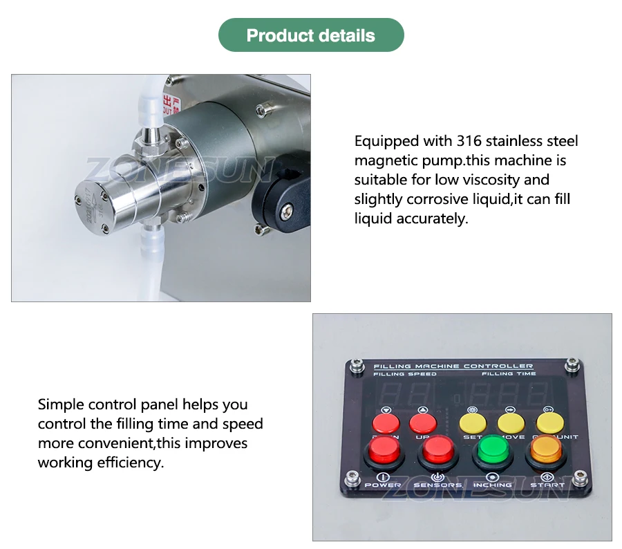 This small automatic filling machine is equipped with high accuracy magnetic pump,it is good for filling low viscosity liquid like water,essential oils,juice etc.Multiple filling nozzle can be customized according to production need.This machine is good for small scale prodcution,the automatic working mode helps you save production.