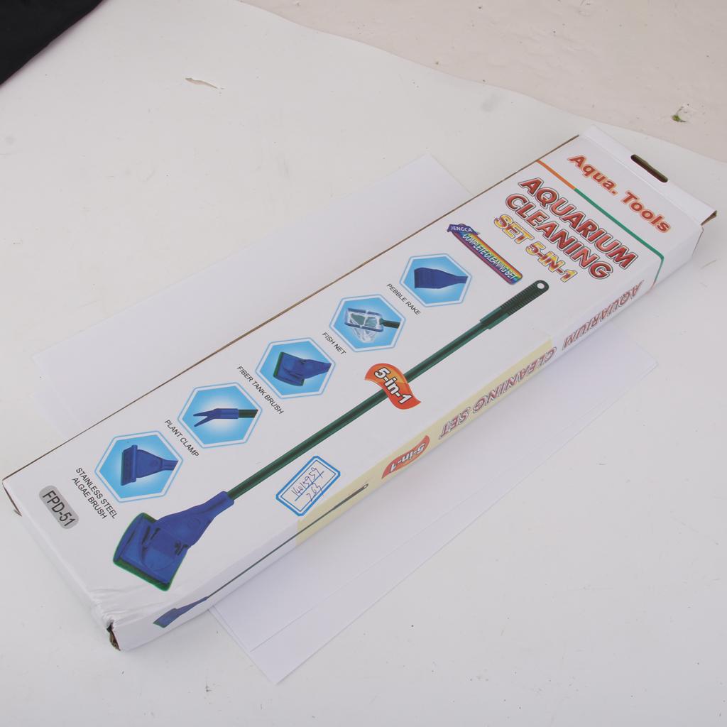 The 5 accessories, a fish net,an algae scraper, a window sponge,a plant and a gravel rake,make aquarium maintenance as simple as can be.