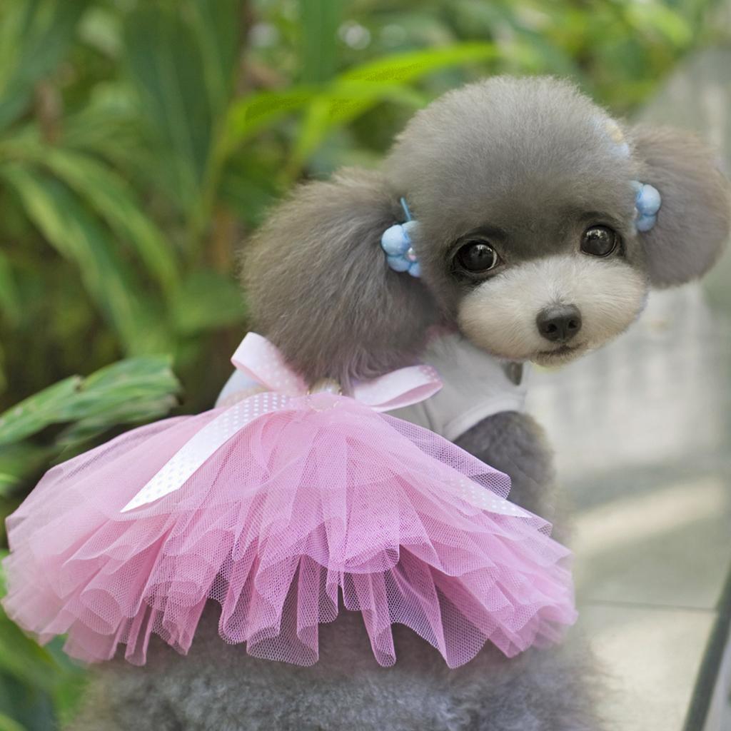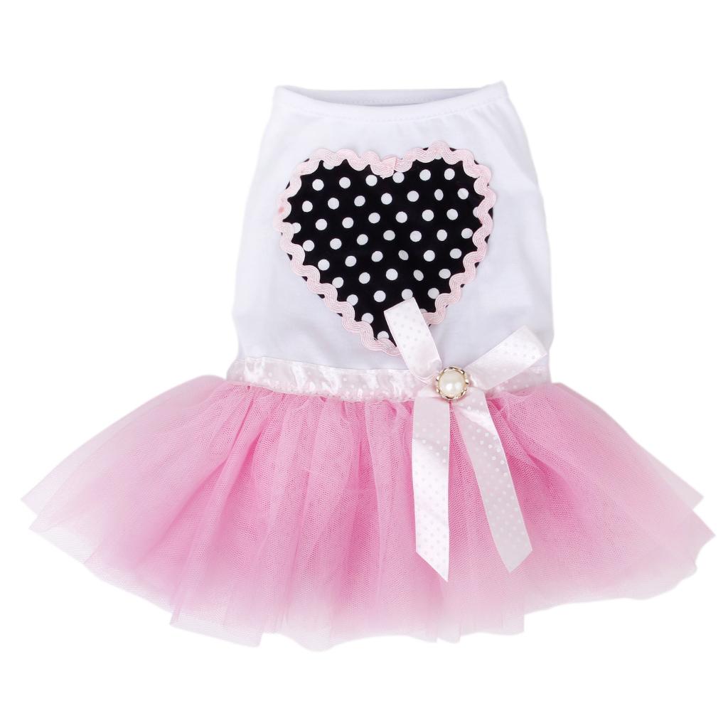 Beautiful dog dress gives pet a bright, breezy, and ultra fashionable look for warm weather outings. Super sweet dog dress features cute heart pattern and tulle hem. This dog dress is perfect for parties or everyday strolls.