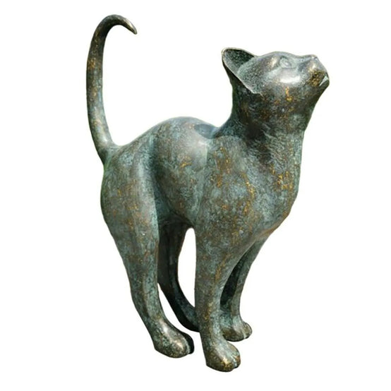 Features: We are very happy that can offer you unique statues This is a very nicely designed statue of a cat with a curved back. Very decorative and of high quality. Made with a very nice green colored patina. This Cat Statue is exclusive to my shop -- you won't find it anywhere else in the world. I pay special attention to detail to make sure you have a quality item you will be proud to display in your home or garden for many years to come. Beautiful bronze sculpture of a cat with a rounded back