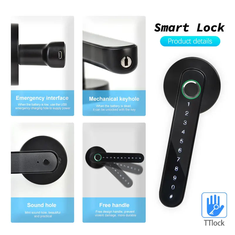 1. 6 ways to unlock: WiFi APP Access(optional), BLE APP Access, Fingerprint Unlock, Pass code unlock, Card unlock, Mechanical Key
