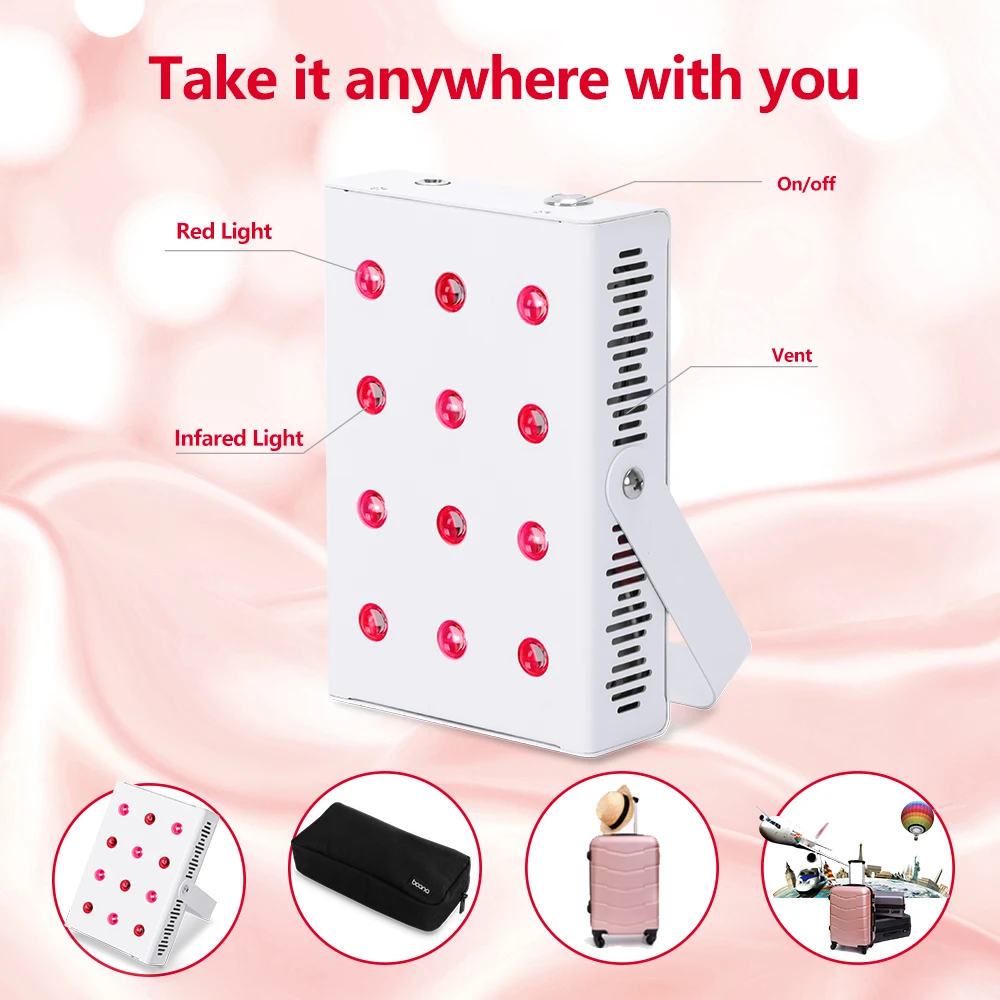 12 bulb portable red light therapy: RD60 red light panel is portable,12 bulbs, and has a dual wavelength combination wavelengths of 660nm and 850nm Quick set up: The kit comes complete with RD60 12 bulb red light device, power cord, external charger, travel bag, goggles Getting started: Simply plug the red light lamp into a power supply and turn on the switch. This red light therapy panel is lightweight, portable and easy to set up; you can take it with you wherever you go and enjoy the most optimal light therapy at all times