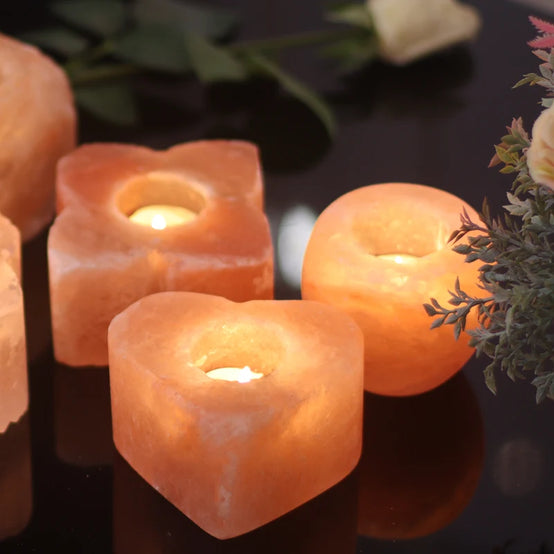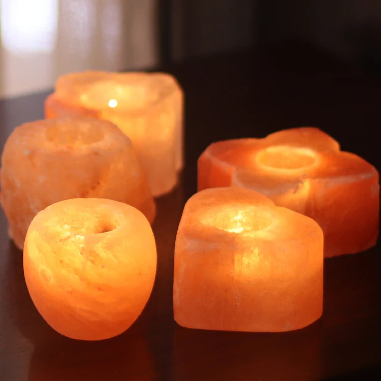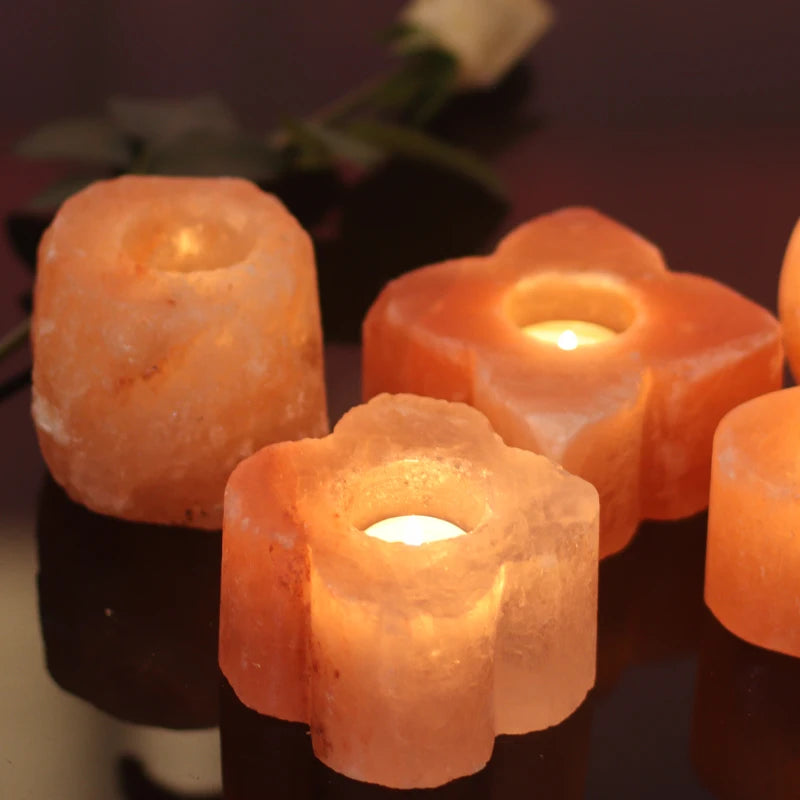 * PURPOSE Let the beautiful flicker and glow of your tea lights be enhanced by our unique salt crystal candle holders. The elegant shapes of the holder and the soft pink glow they emanate will provide a calming and softening environment.