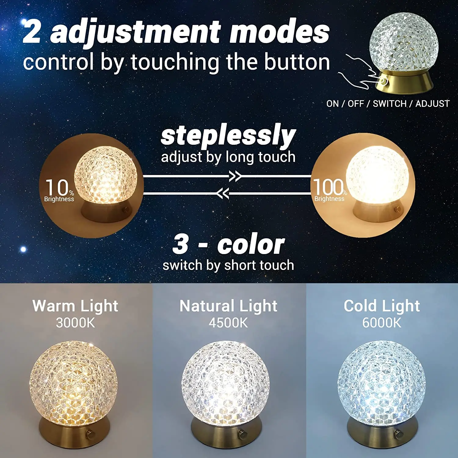 Easy to use for everyone! Sensitive design--short touch the button to switch ON/OFF/3-color modes(3000K Warm Light/4500K Natural