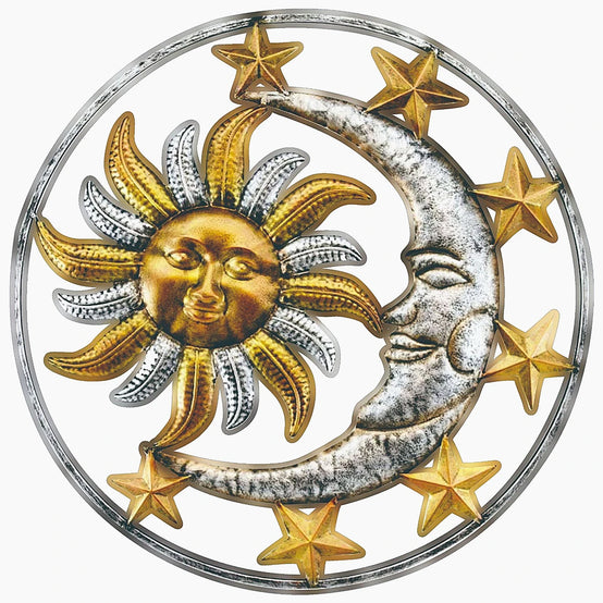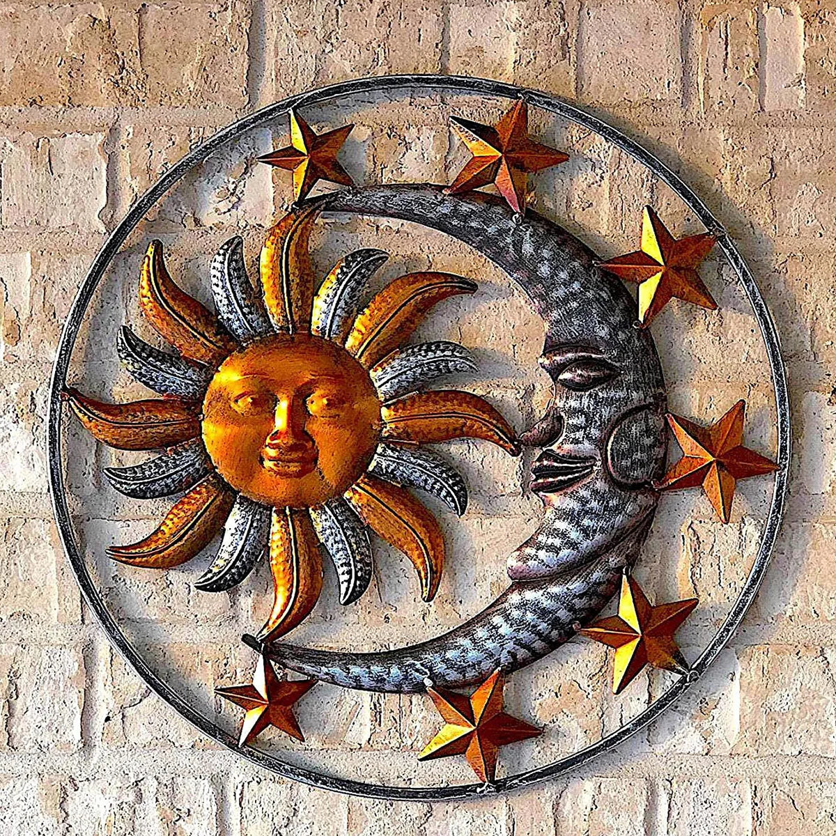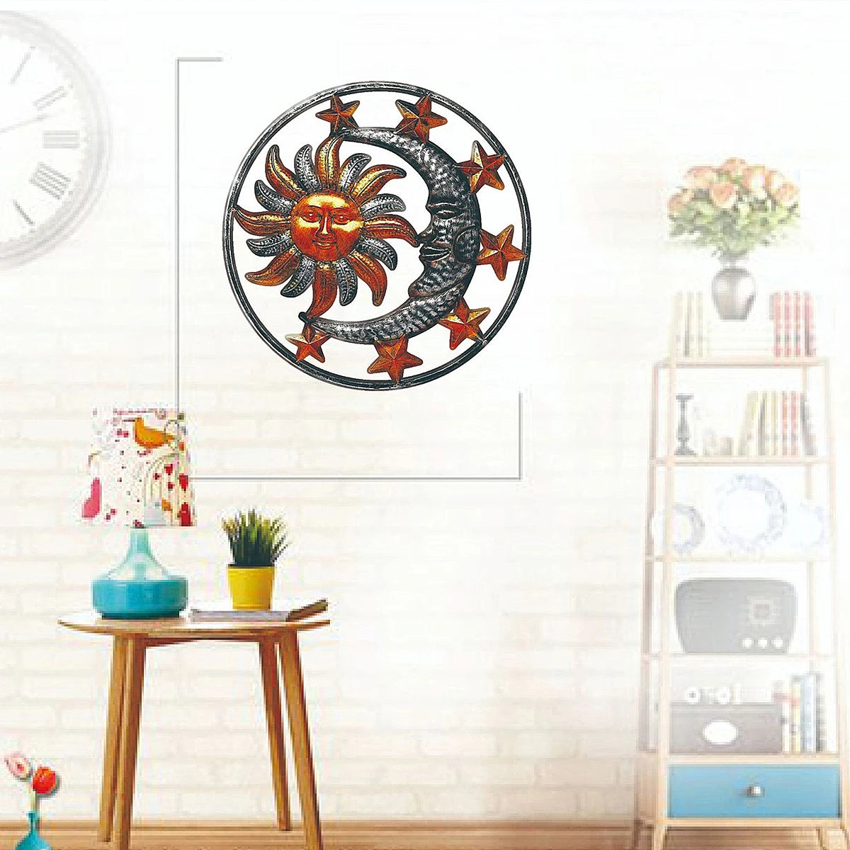 Features: Wall decoration: Adopt metal sun star wall art decoration, suitable for family or business. Outdoor living wall decoration: The celestial design wrapped in a circular frame can be installed on walls, fences, courtyards, porches, balconies, sun gardens, and backyards. Iron art: weatherproof, strong, decorative and charming metal art sculptures, painted in gold, silver and bronze. Garden gift art: well-built and sturdy wrought iron circular hanging wall decoration, suitable for year-round use.