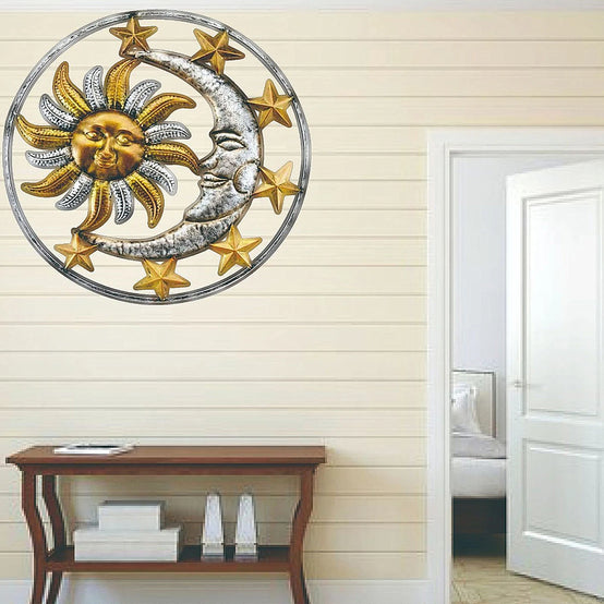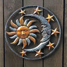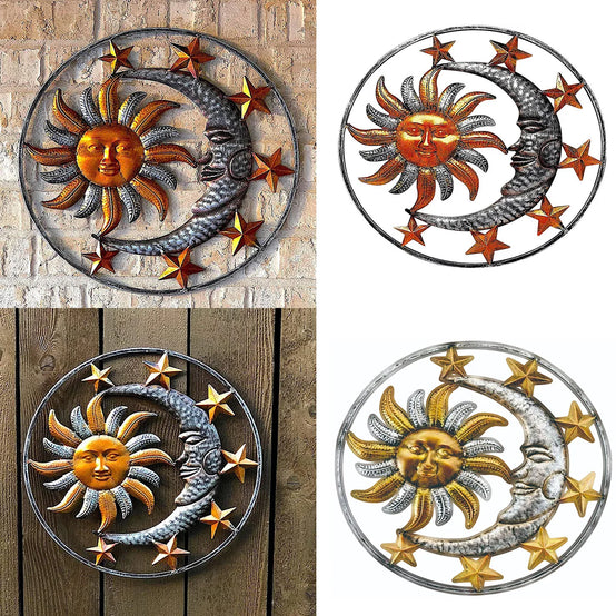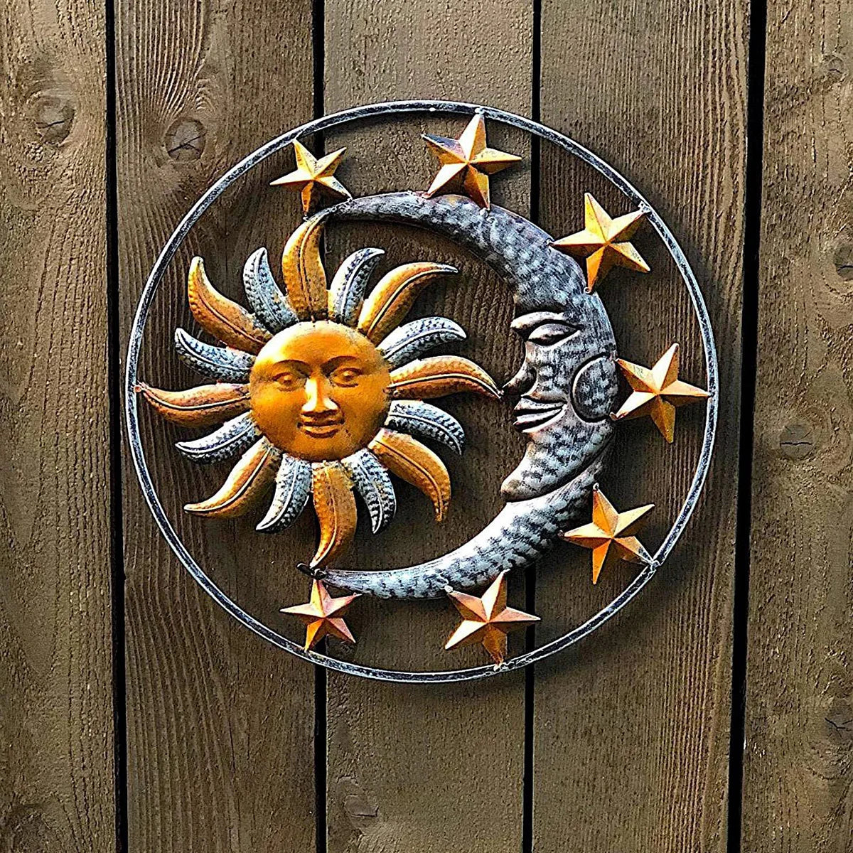 Features: Wall decoration: Adopt metal sun star wall art decoration, suitable for family or business. Outdoor living wall decoration: The celestial design wrapped in a circular frame can be installed on walls, fences, courtyards, porches, balconies, sun gardens, and backyards. Iron art: weatherproof, strong, decorative and charming metal art sculptures, painted in gold, silver and bronze. Garden gift art: well-built and sturdy wrought iron circular hanging wall decoration, suitable for year-round use.
