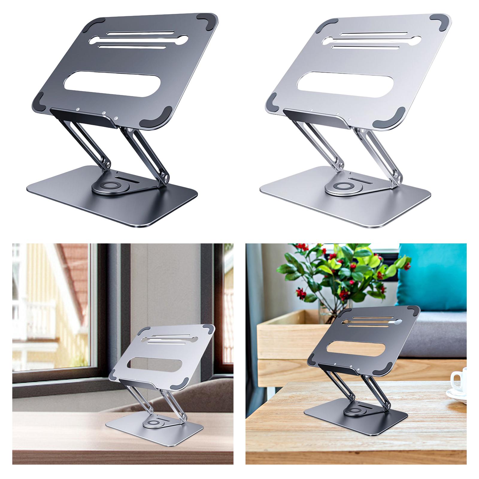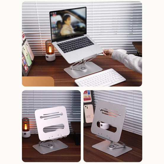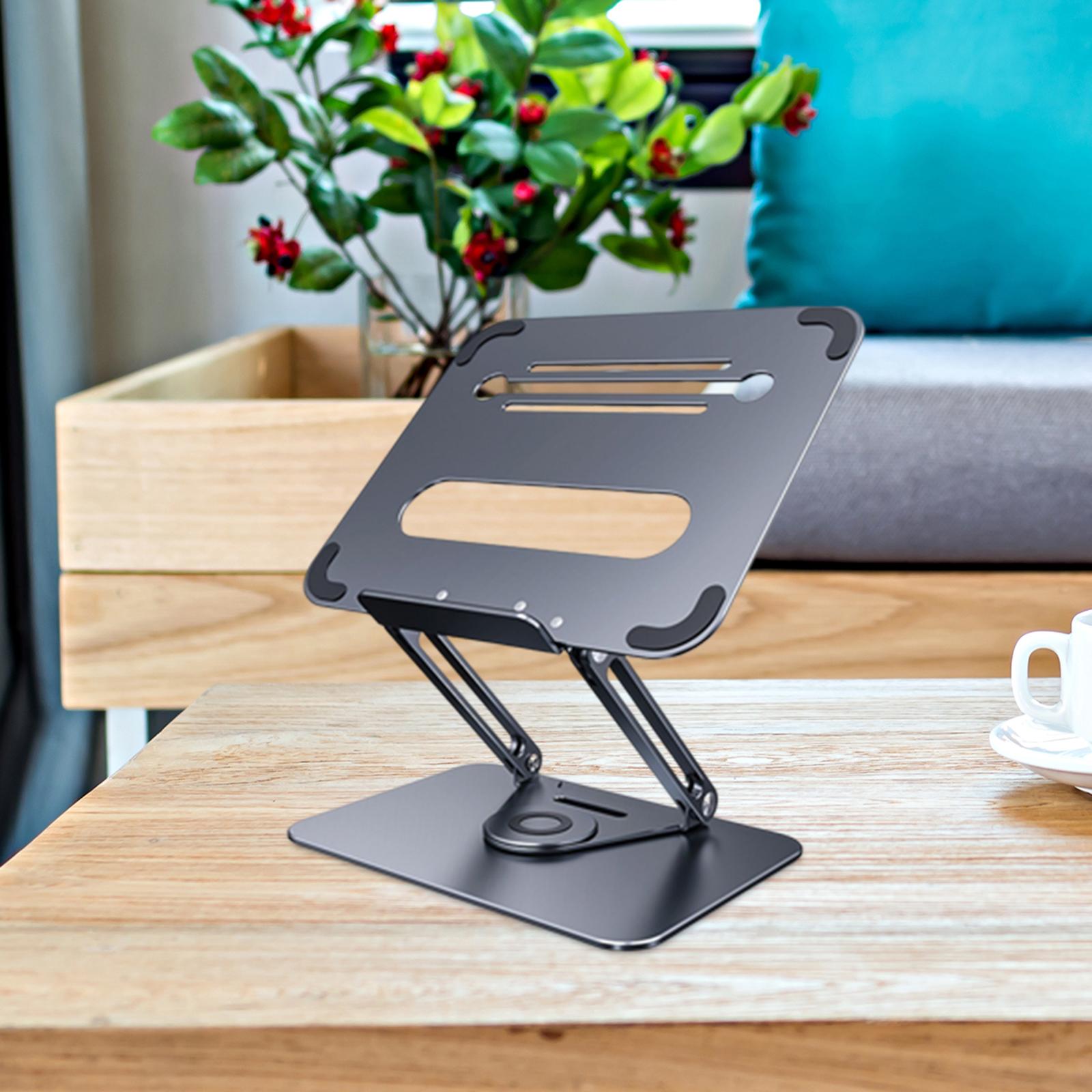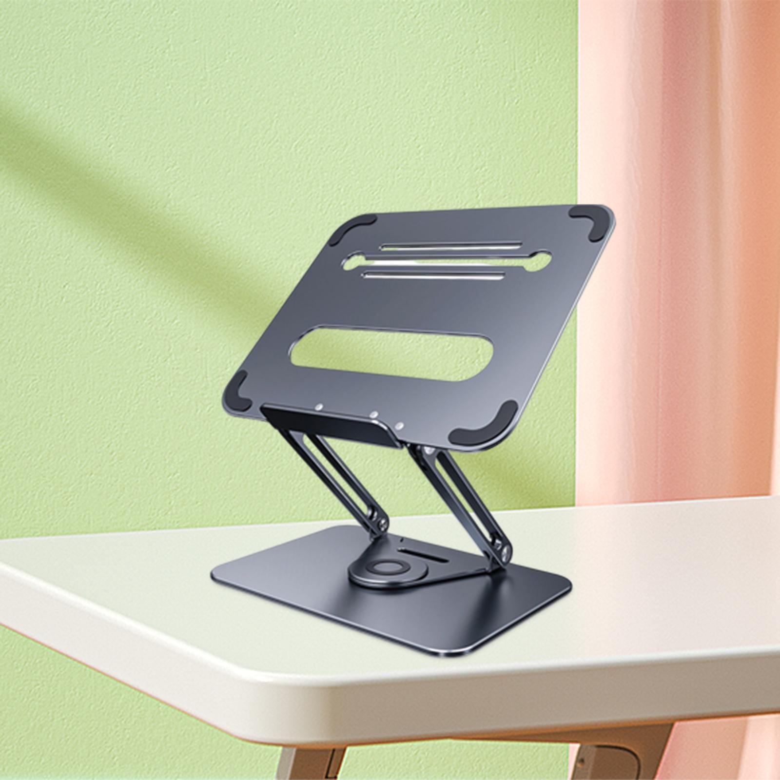 - 360°ROTATION BASE: This Laptop Stand For Desk featuring a 360° rotatable axis connecting with the base, this laptop stand allows you to swivel your laptop to any angle, this give you plenty of flexibility in terms of working position, It will be especially useful for group projects or meetings.Using the principle of building structure, using triangular shaft triangular support, balanced force, stable and not shaking.