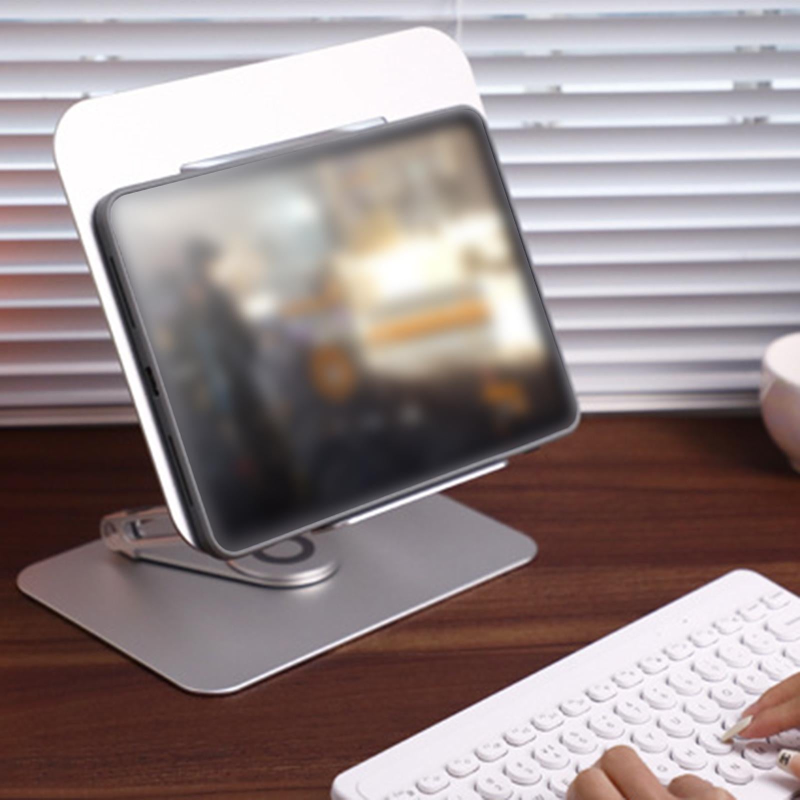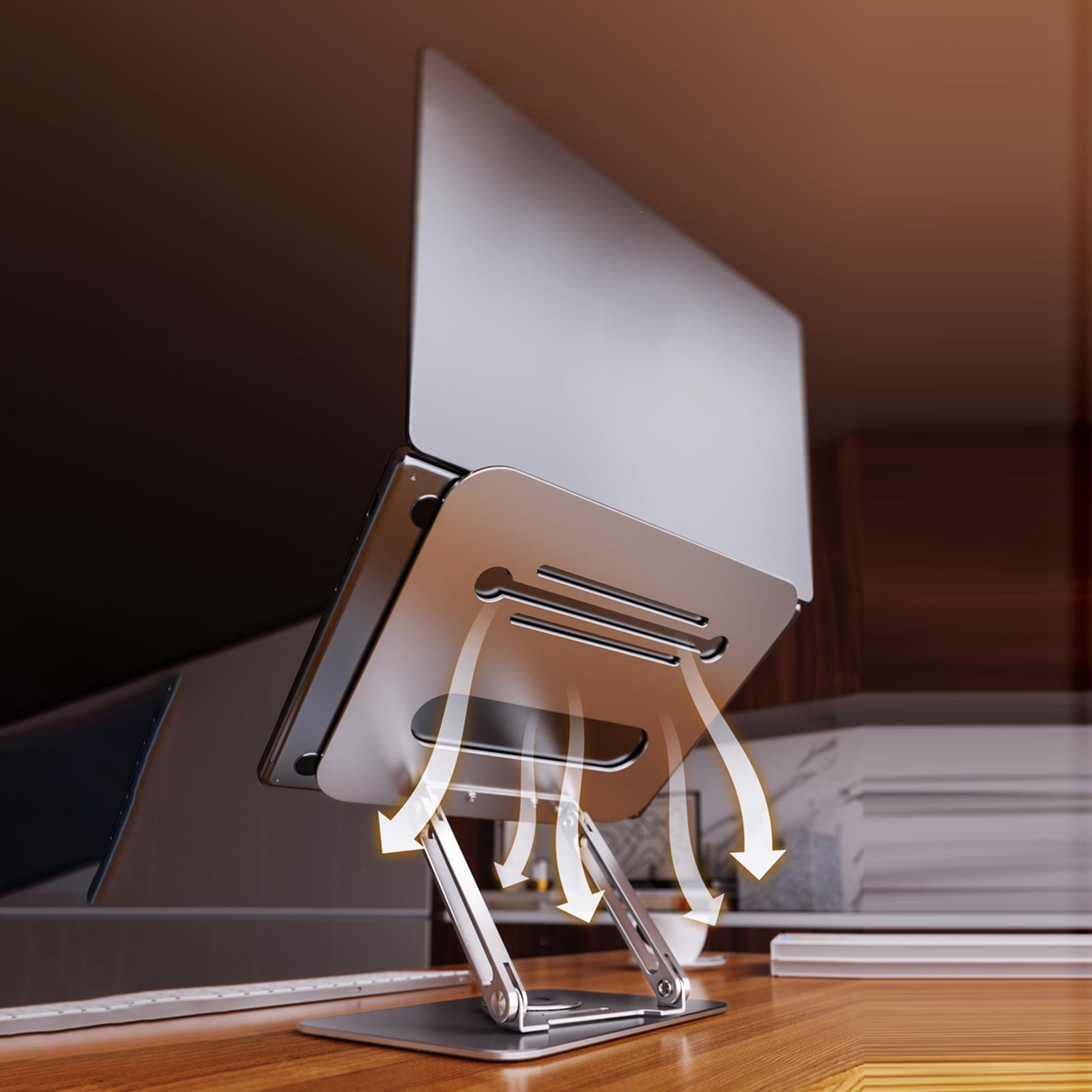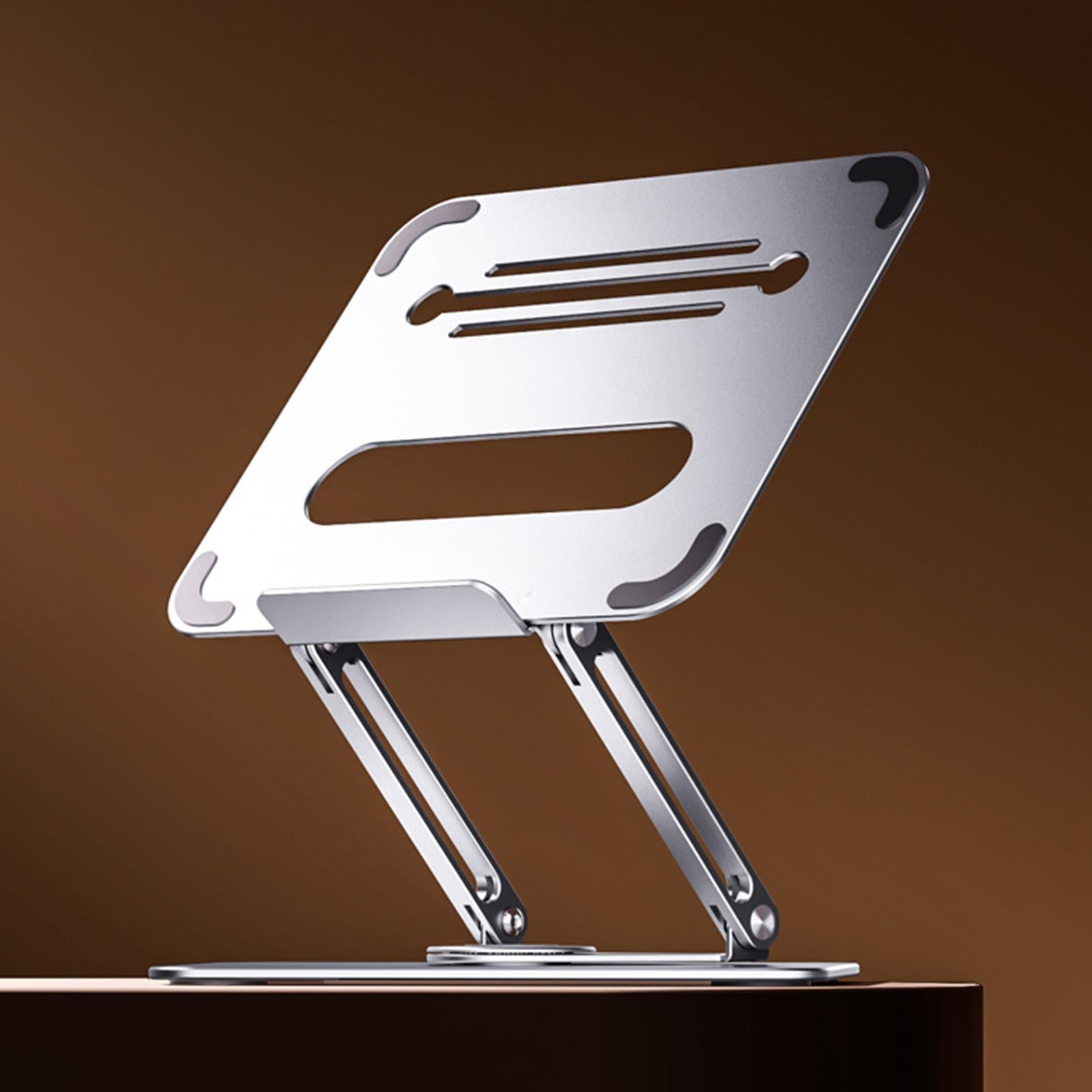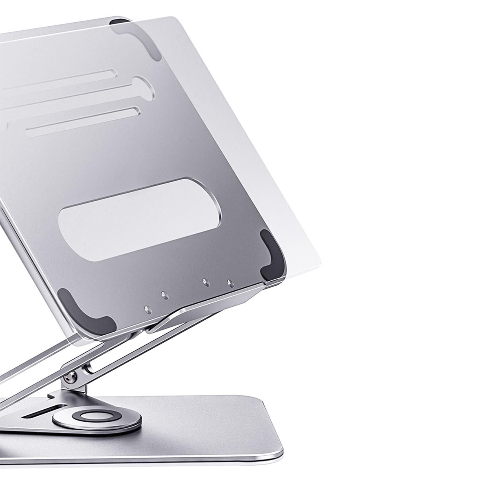 - 360°ROTATION BASE: This Laptop Stand For Desk featuring a 360° rotatable axis connecting with the base, this laptop stand allows you to swivel your laptop to any angle, this give you plenty of flexibility in terms of working position, It will be especially useful for group projects or meetings.Using the principle of building structure, using triangular shaft triangular support, balanced force, stable and not shaking.