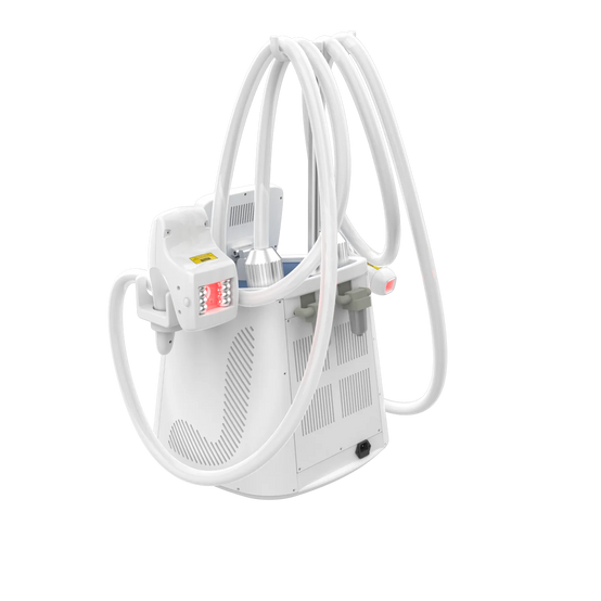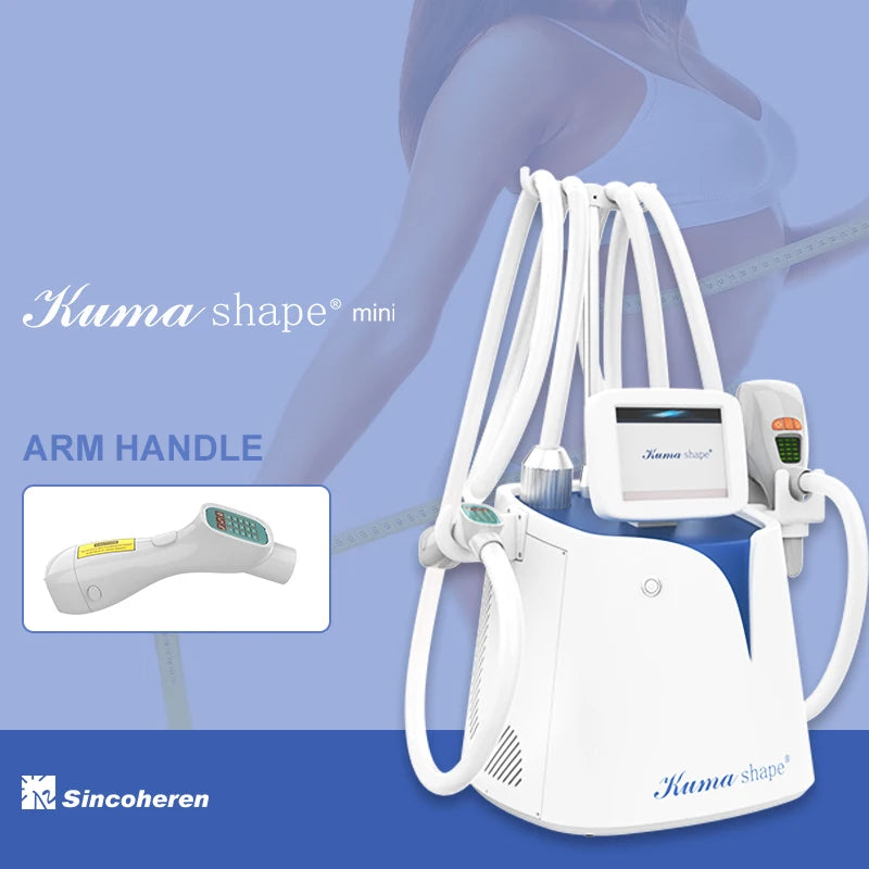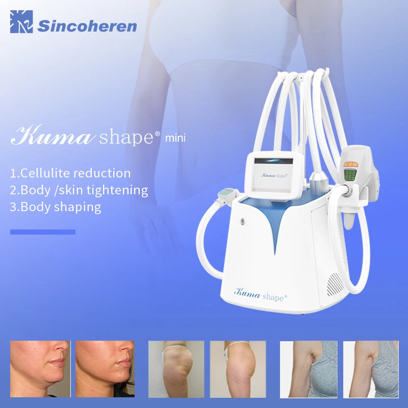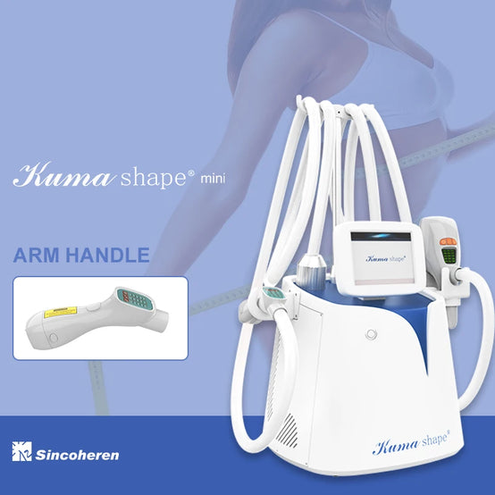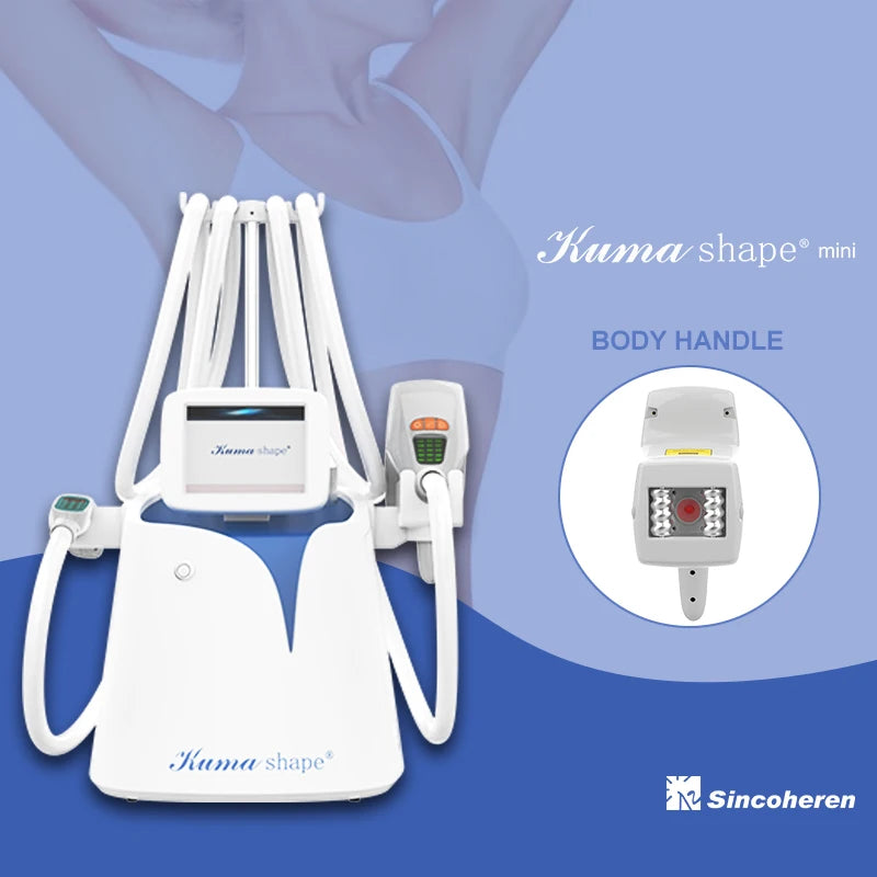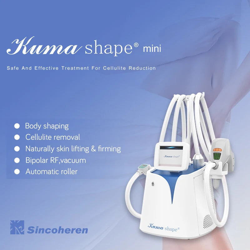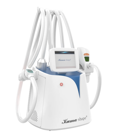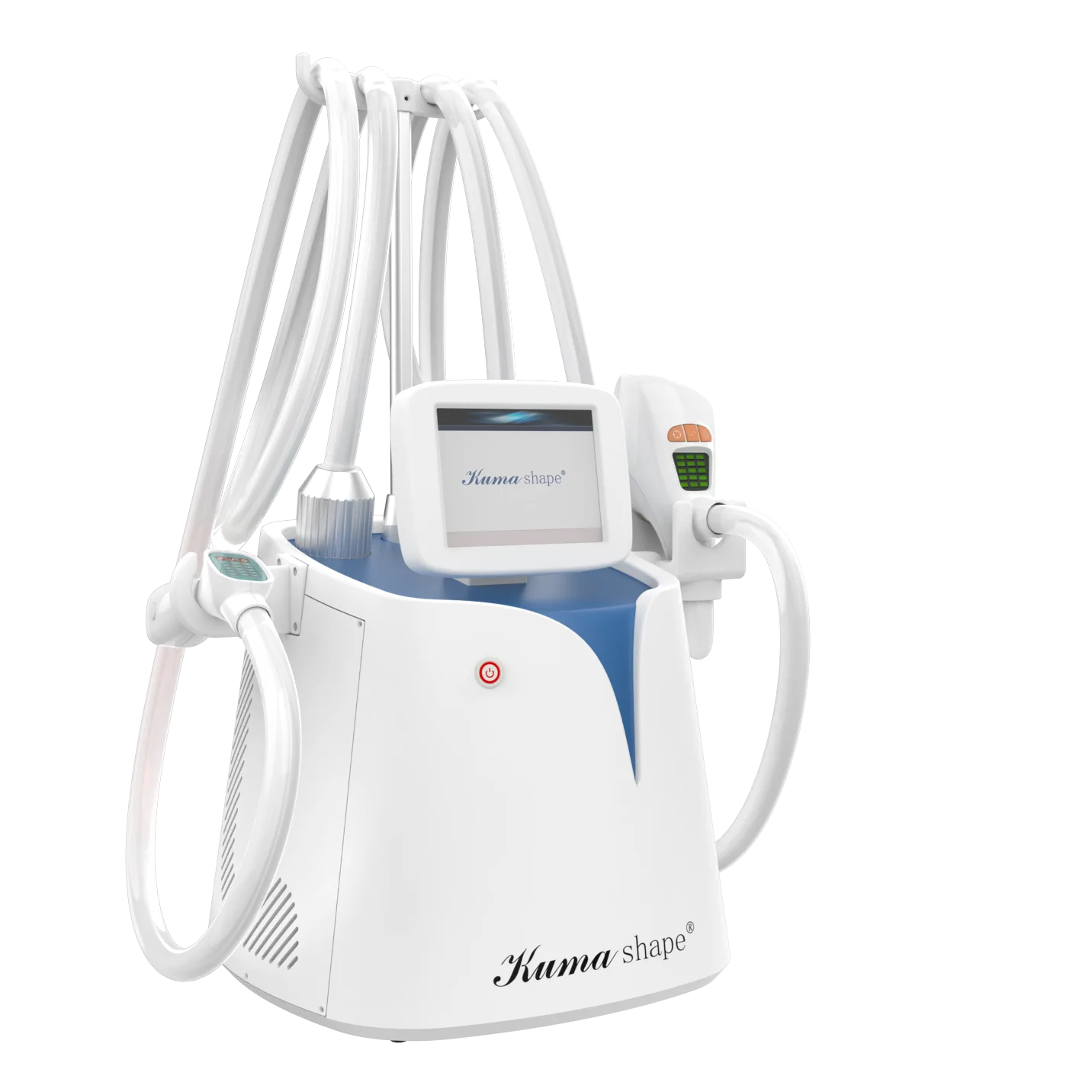 Kuma Shape slimming machine is a combination of bipolar radio frequency, infrared ray, negative pressure, and automatic mechanical massage, with the controllable inhalation electro- thermal simulation technique being its therapeutic mechanism. The handle of the fat burning machine is designed with dense transmitters and transmission systems. The Radio frequency penetrated into the skin will rapidly generate a thermal effect and cause collagen stimulation and contraction, resulting to a skin tightening effect and leading the adipocyte to collide and rub with each other violently. In this way, a large amount of calorie will be consumed and the adipocyte will get much smaller. When the vibration frequency reaches a certain range, the adipocyte will be blasted instantaneously, and excreted out the body through livermetabolism.