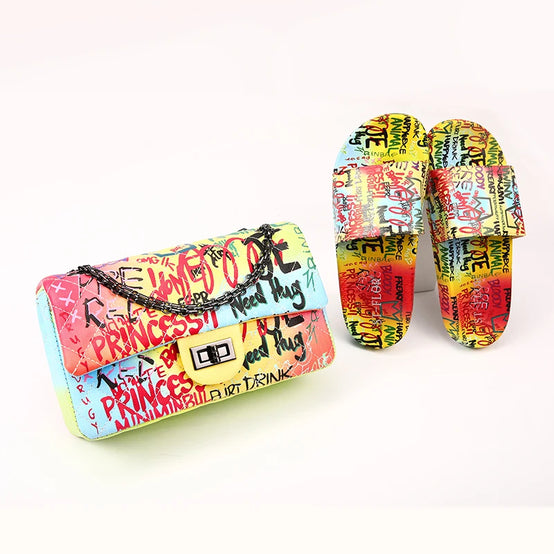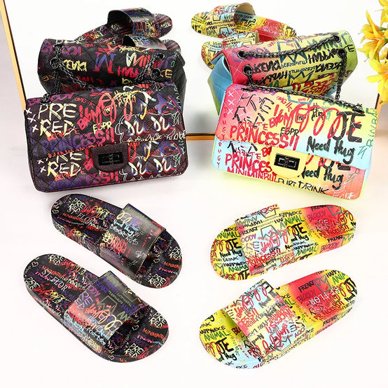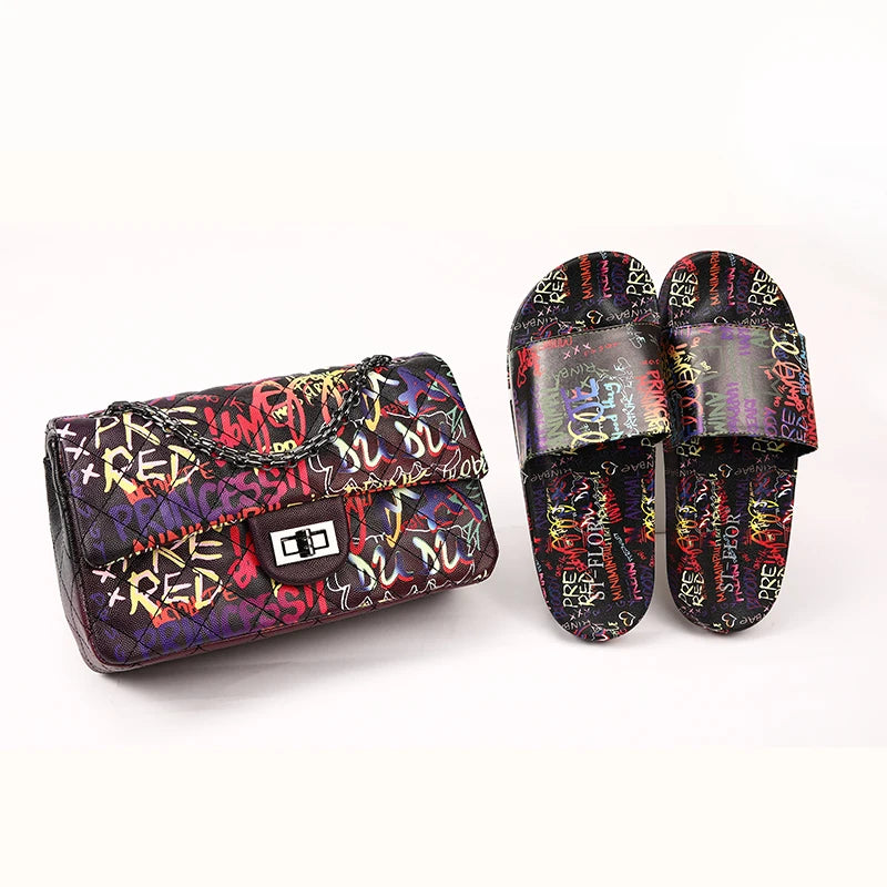 purse and shoe sets 2021 new graffiti shoes matching sandals slides women bags and slippers purses and handbags