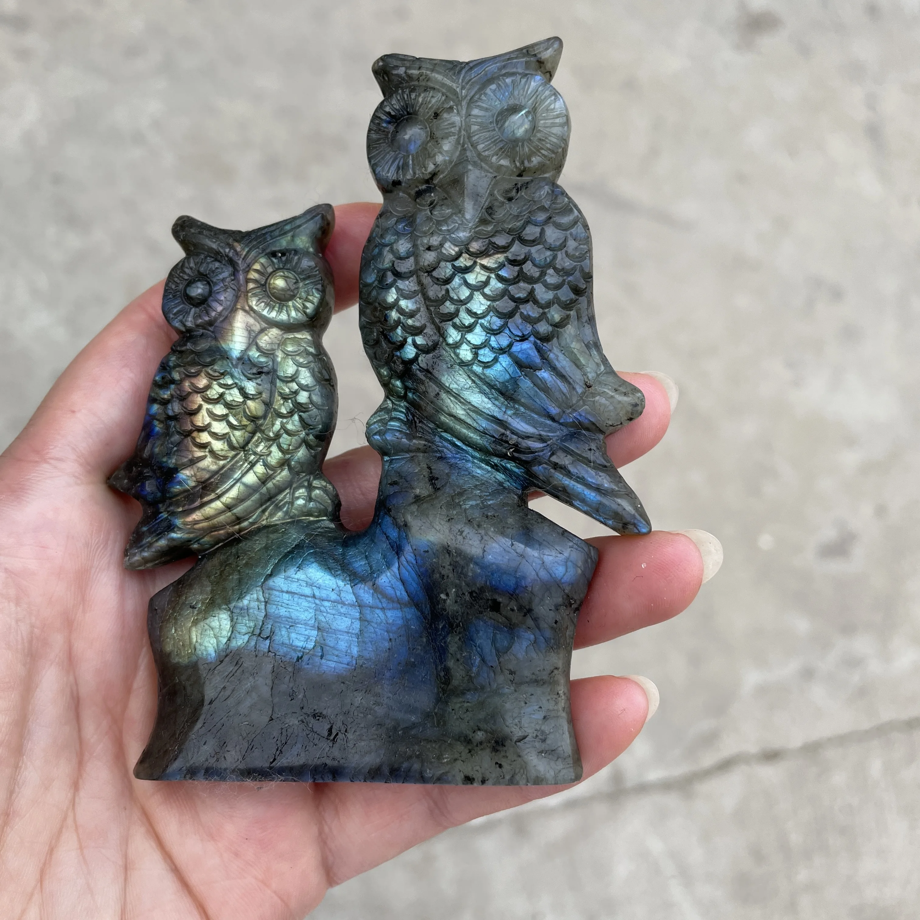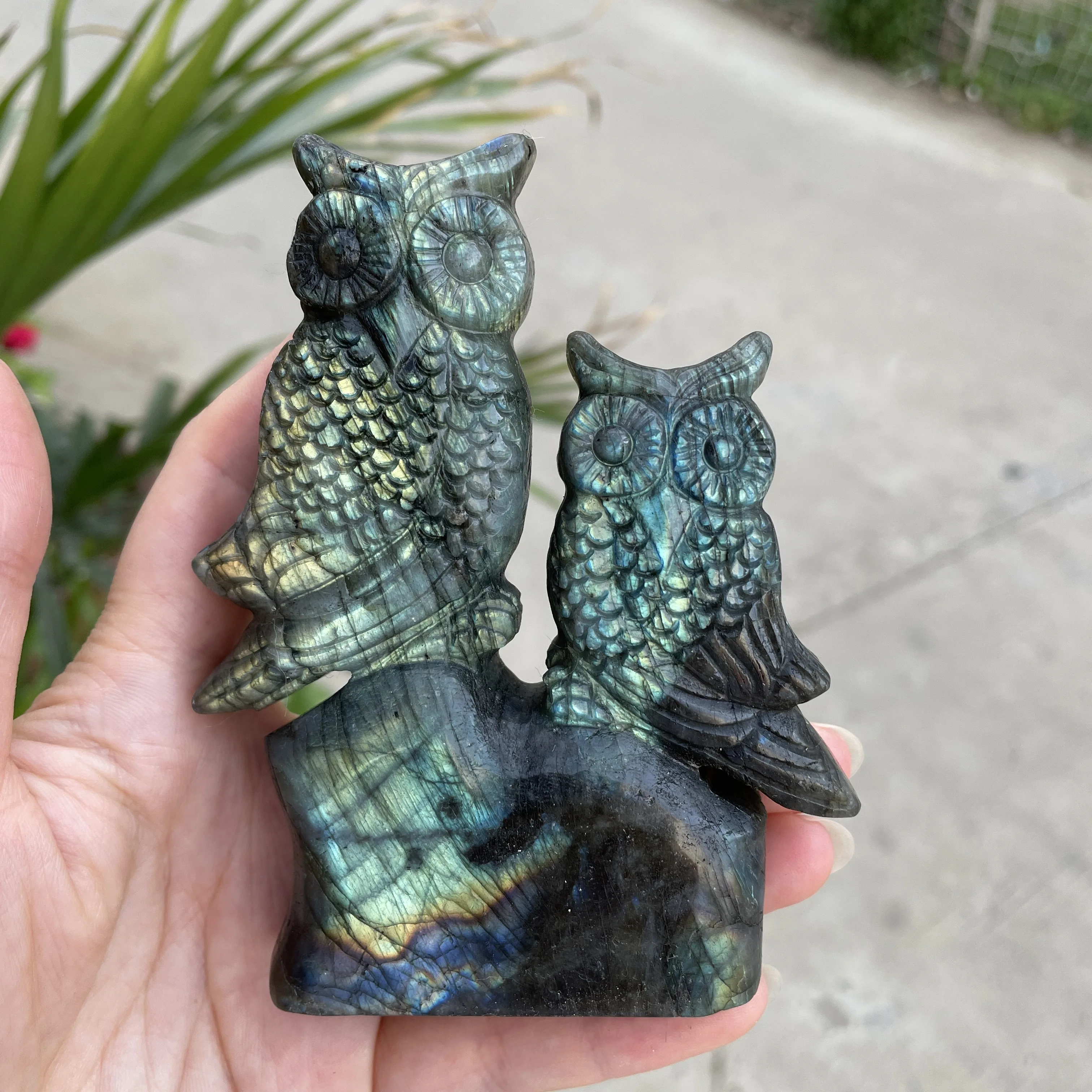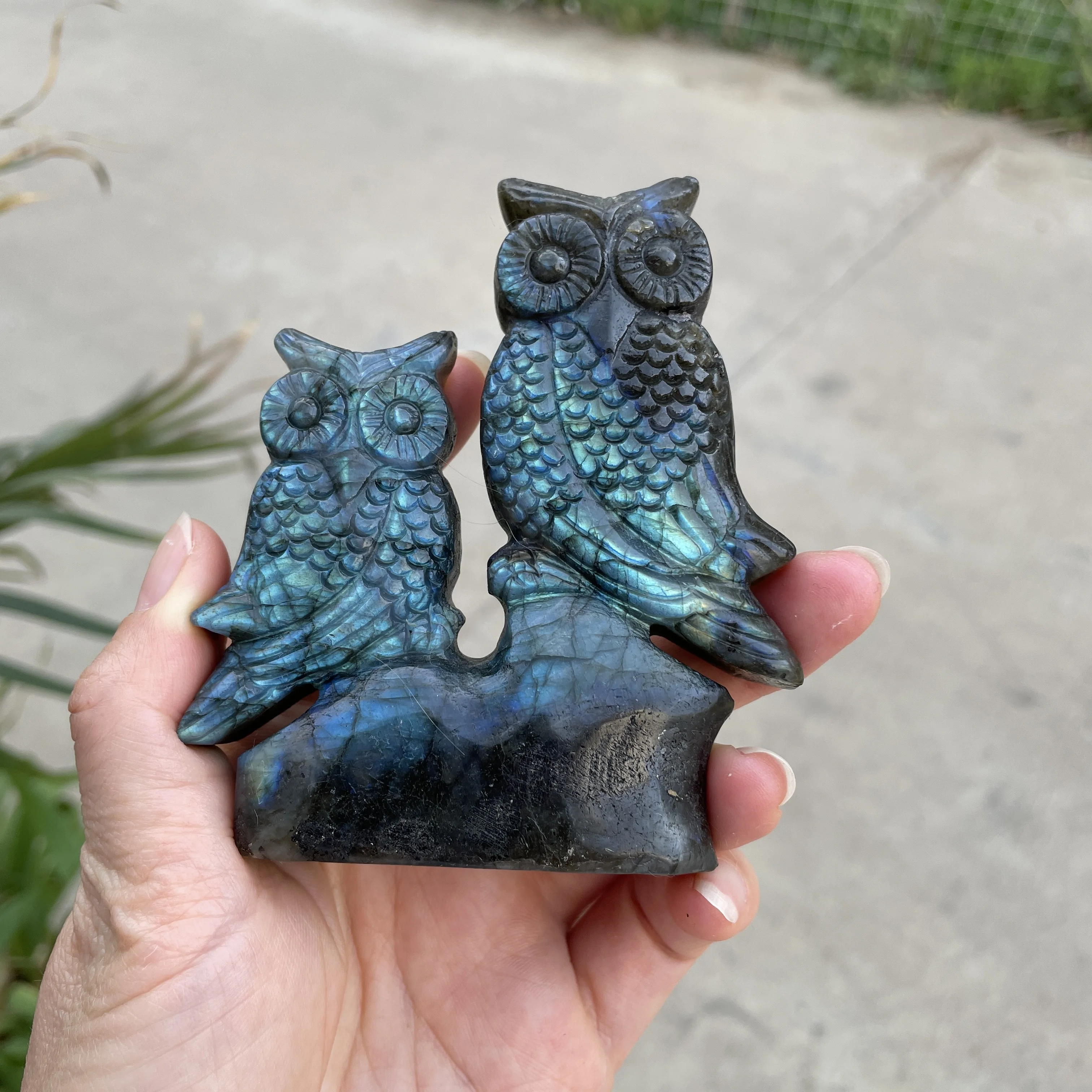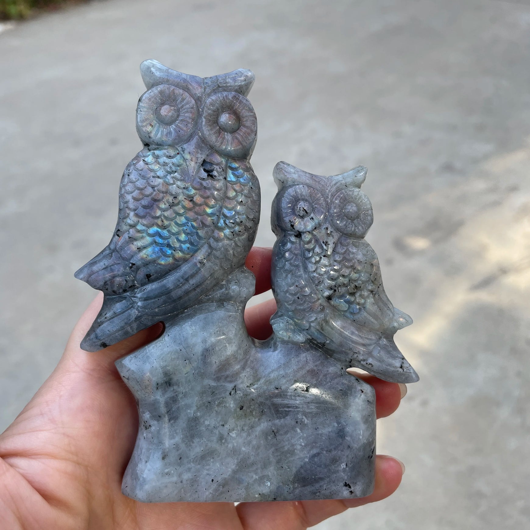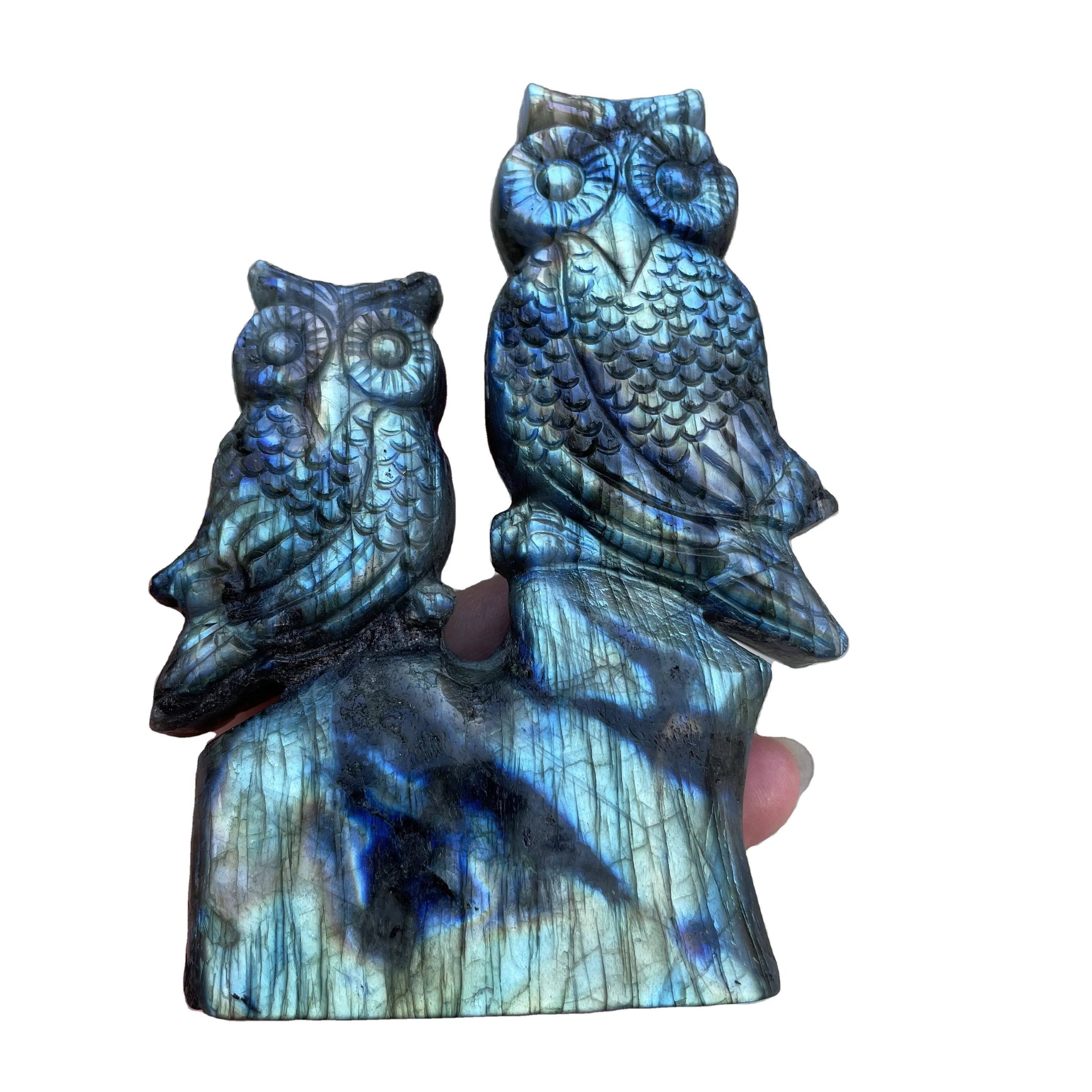 Wholesale High Quality Natural labradorite carving double owls blue flashy For Gifts Decoration Healing