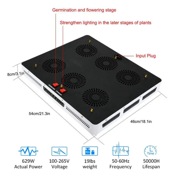 COB + Dual-chip,3000K 5000K High Quality Efficiency COB Chip and Epistar dual-chip,most efficient spectrum,high PPFD.Two cooling fans with double ball(import from Japan) and big aluminum heat sink to protect the grow lights from high temperature,good cooling,long lifespan.Photosynthesis and promote healthy growth budding and flowering.
