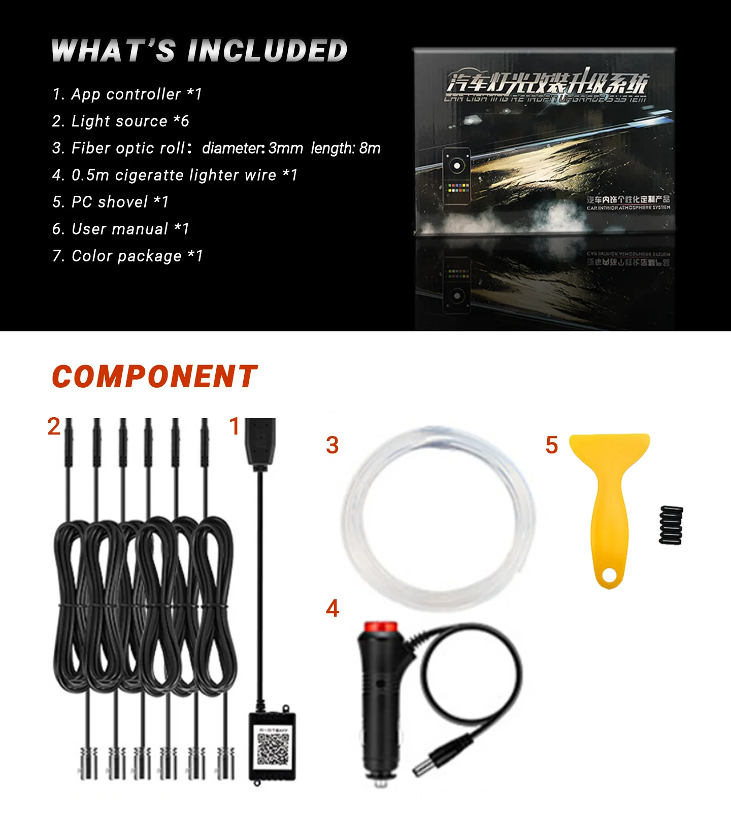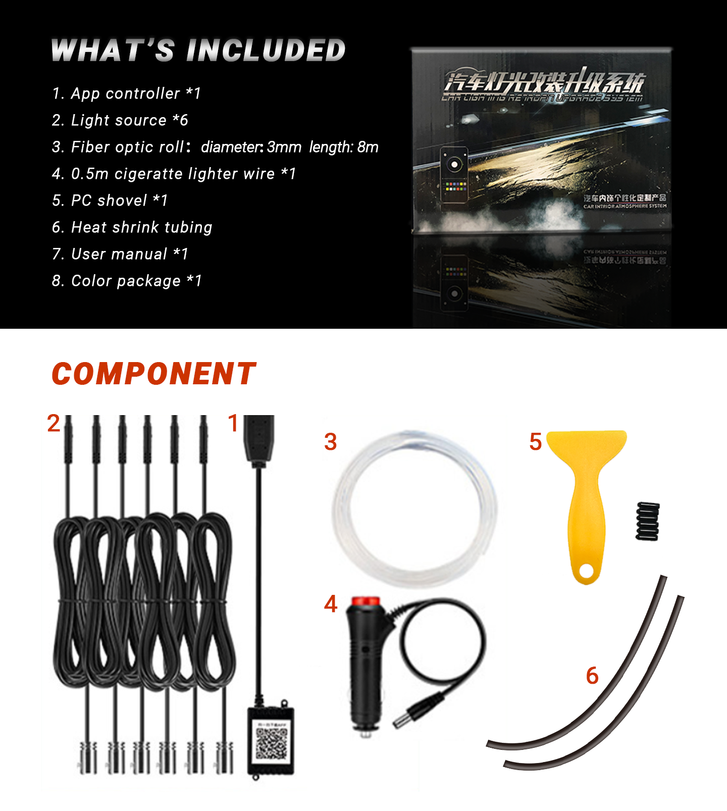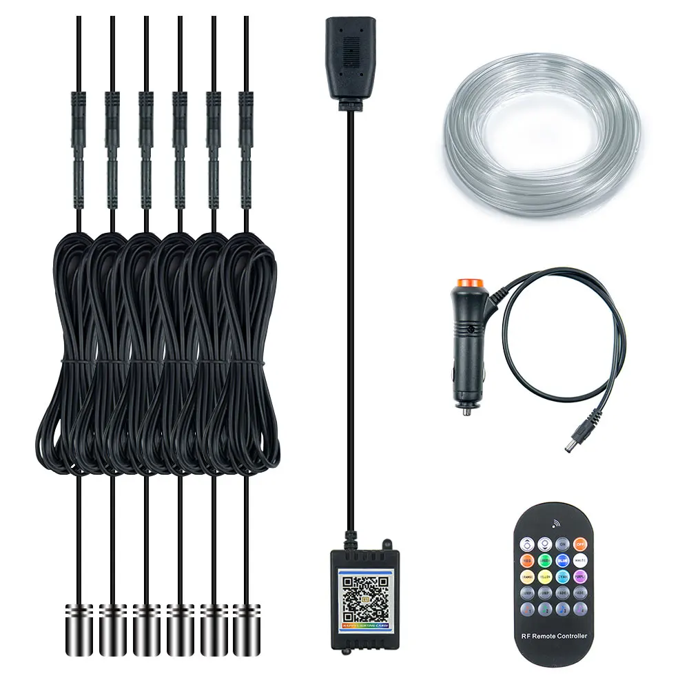 Features: 1: 6M fiber optic rolls + 5w LED heads 2: Built in Blue&tooth functionality. 3: Support dozens of light modes, such as RGB color changing, sync light to music, voice. 4: More than 16 million colors for option, App control 5: High brightness with low power consumption, ideal for car decoration, parties, camping, bar atmosphere and so on. 6: The fiber optic can be cut to fit, easy to install.