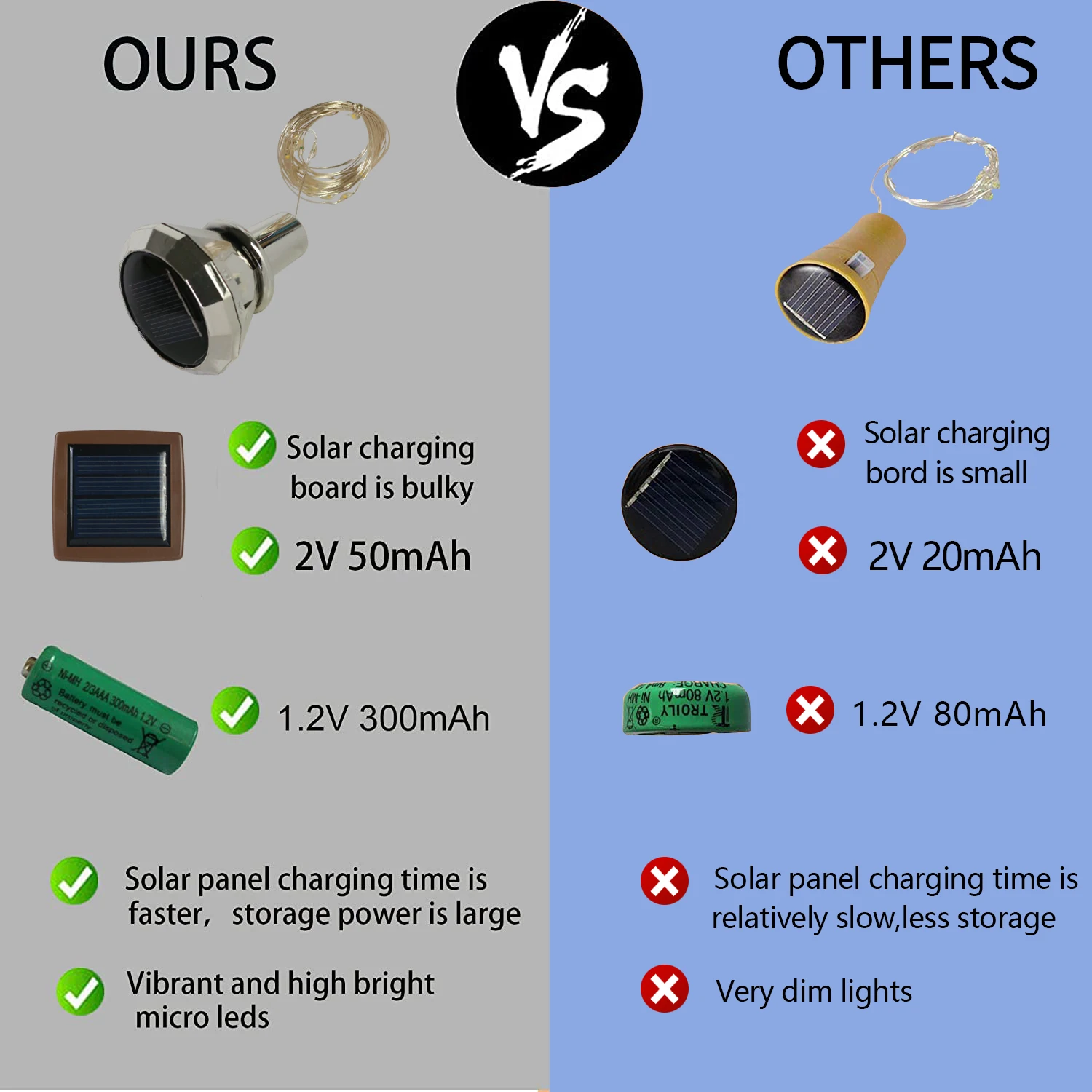 Number of LED lights: 20 LED lamp beads with a distance of 10cm Solar panel: 2V/60mA, polysilicon