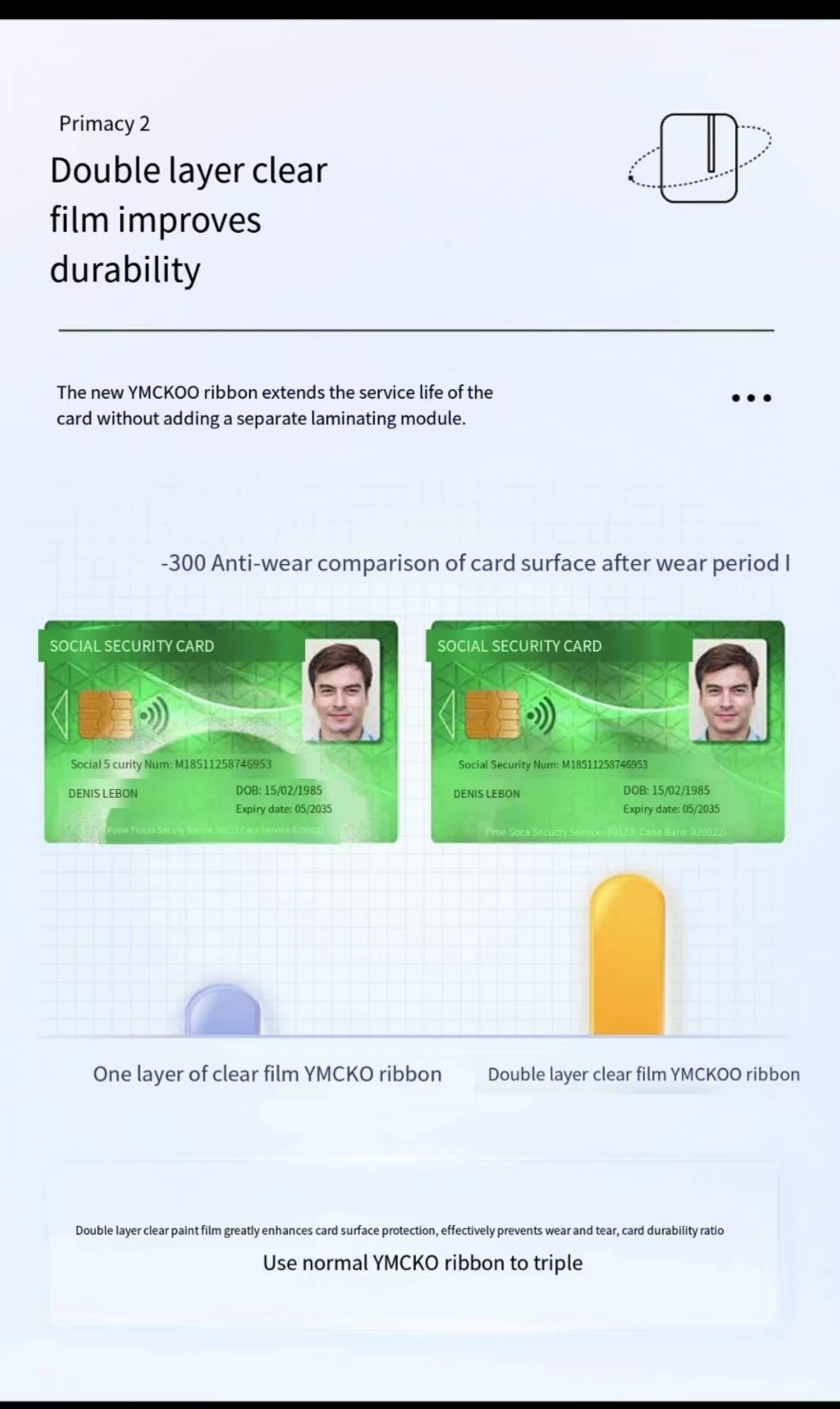 provides enhanced wear and abrasion protection, with 3 times the abrasion resistance of standard YMCKO ribbon.