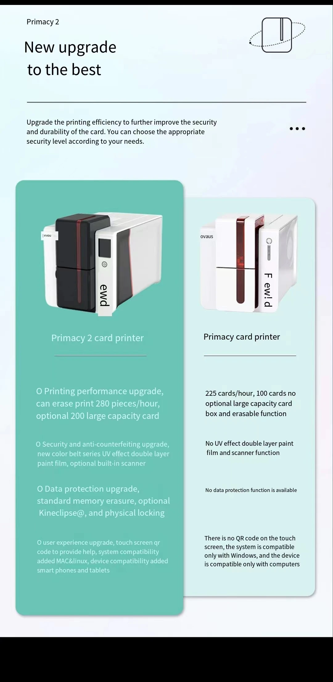 Its printing speed of up to 280 cards per hour, combined with its 100- or 200-card feeder, are the two major assets of the Primacy