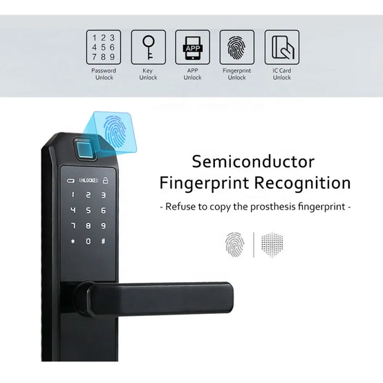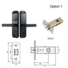 Unlock mode: APP / Fingerprint / Password / Smart card / Key Fingerprint read: Semiconductor Sensor Color: Black/ Red bronze/ champagne gold Card User: 50 Fingerprint User: 50 Chip Type: Dual Core Driver Read time: 0.3 seconds Touch screen: IML Material Working power: 4 x AAA 1.5V batteries (not include) Operating temperature: -25 to 55 Centigrade Password function: support virtual password Suit for the door thickness about 38 -50mm |