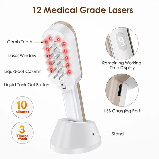 How Does the Laser Comb Work? -- The laser hair growth comb is used for treating hair loss, thinning hair and receding hairline. It helps to stimulate hair follicles, encourage hair regrowth and promote fuller looking hair for men and women. Detachable Independent Liquid Storage Box --The liquid storage box of the laser hair growth comb is very convenient for adding serum and cleaning. With simple operation and portable size, it is perfect for home use and travel friendly. Vibration Massage with Replaceable Silicone Comb --The vibrating massage function helps to improve blood circulation, promote relaxation and stimulate hair growth. It promotes the absorption of hair growth serum. And It is very convenient to replace the silicone comb.
