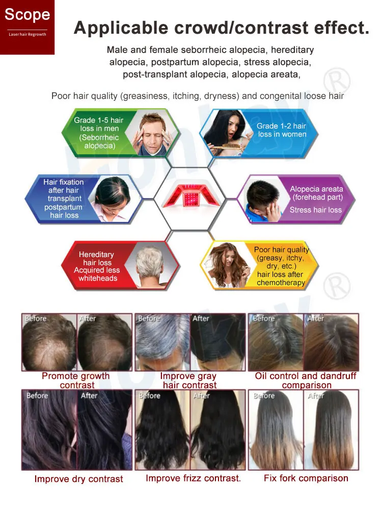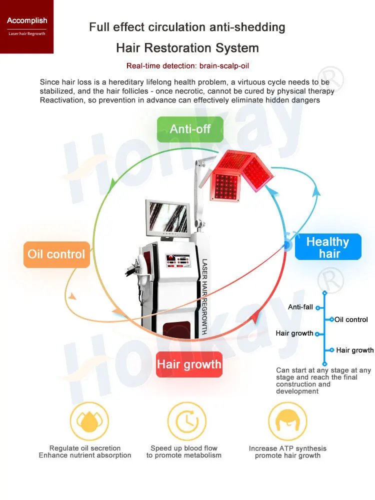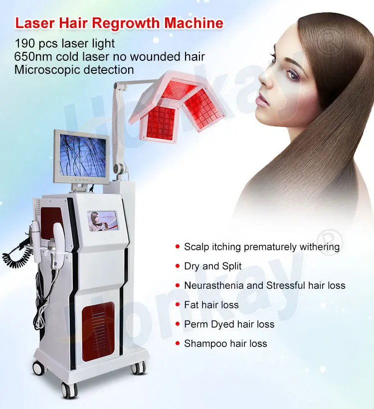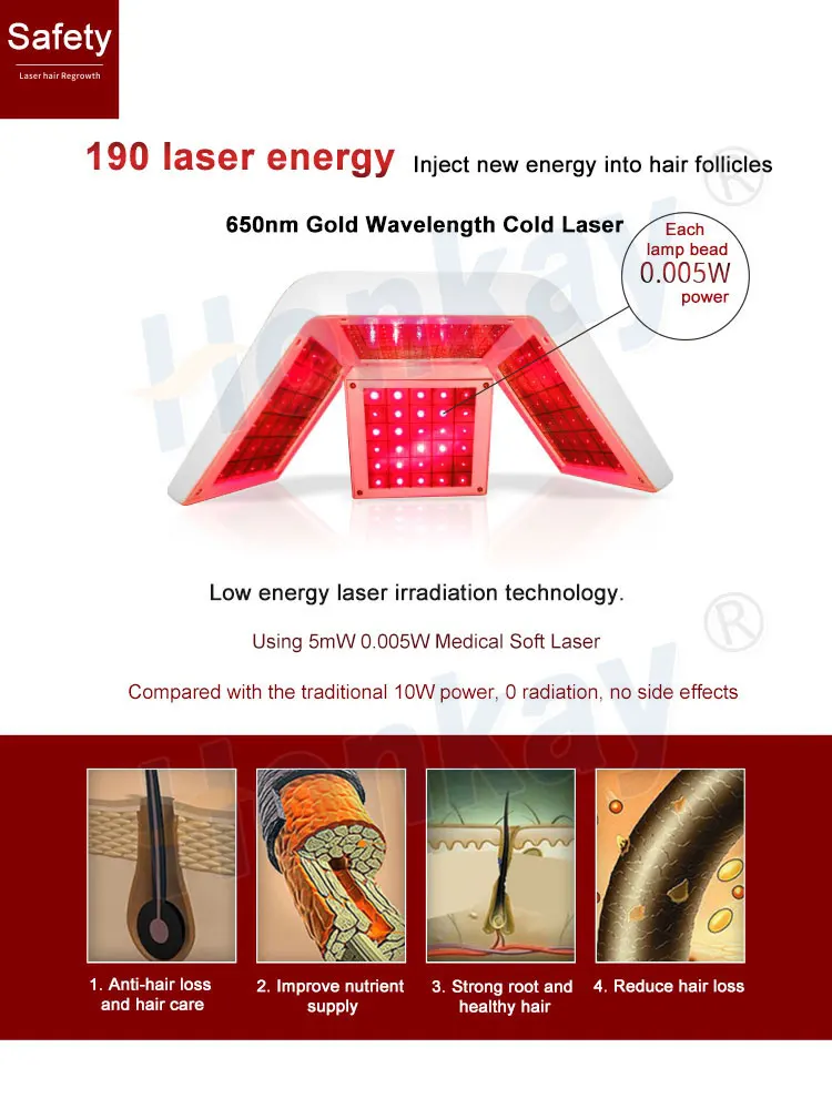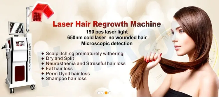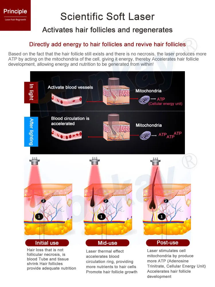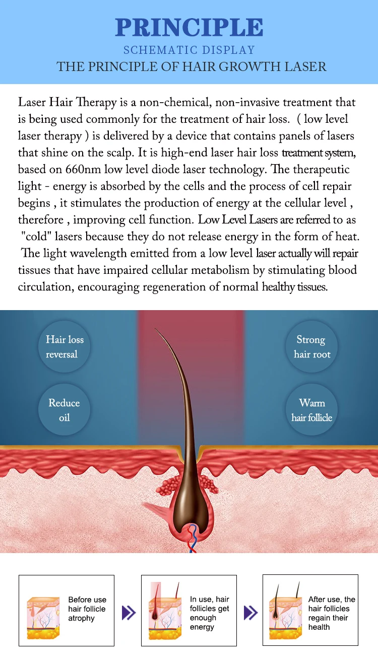 diode laser hair regrowth Working Theory Laser Hair Therapy is a non-chemical, non-invasive treatment that is being used commonly for the treatment of hair loss. (low level laser therapy) is delivered by a device that contains panels of lasers that shine on the scalp. It is high-end laser hair loss treatment system, based on 660nm low level diode laser technology. The therapeutic light - energy is absorbed by the cells and the process of cell repair begins, it stimulates the production of energy at the cellular level, therefore, improving cell function. Low Level Lasers are referred to as “cold” lasers because they do not release energy in the form of heat. The light wavelength emitted from a low level laser actually will repair tissues that have impaired cellular metabolism by stimulating blood circulation, encouraging regeneration of normal healthy tissues.