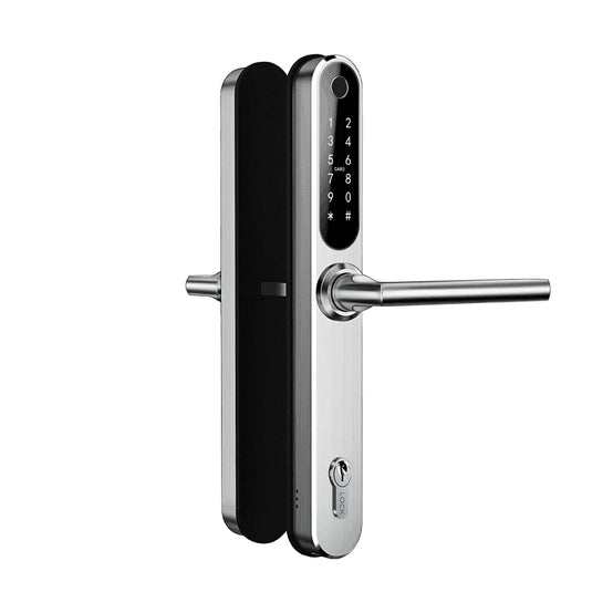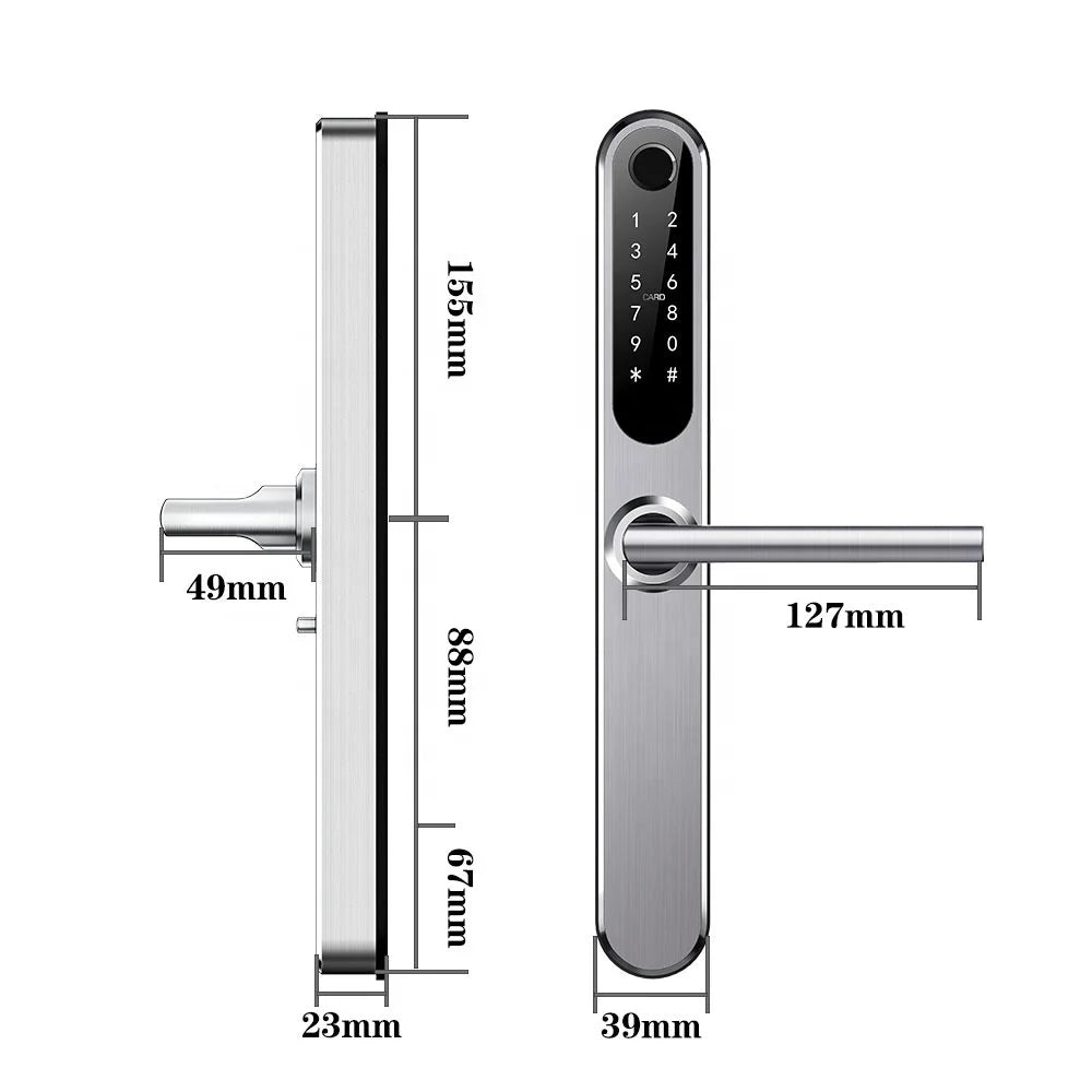 This is our new-designed aluminum smart door lock. Adopt the latest stainless steel structural design, which panel width is only 38 mm, be suitable for any aluminum door which frame is more than 46mm. This lock can also be used for wooden and security doors, and fits all kinds of mortise.