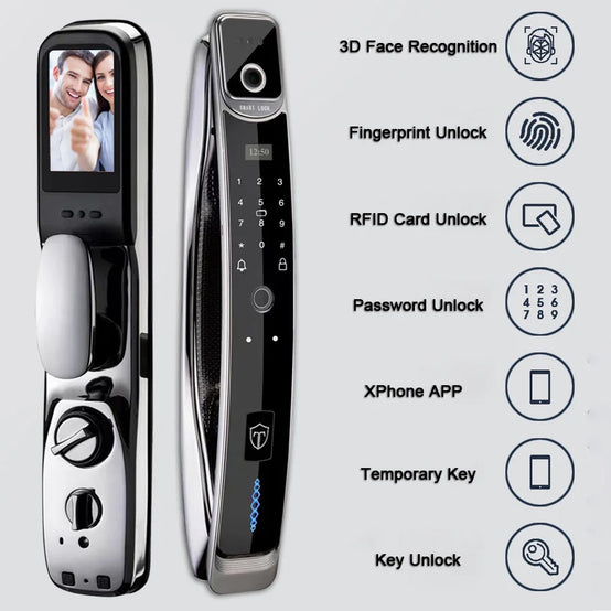 1. 6 unlock ways: 3D infraed Face,Fingerprint, Password, IC Card, Mechanical Key ,APP