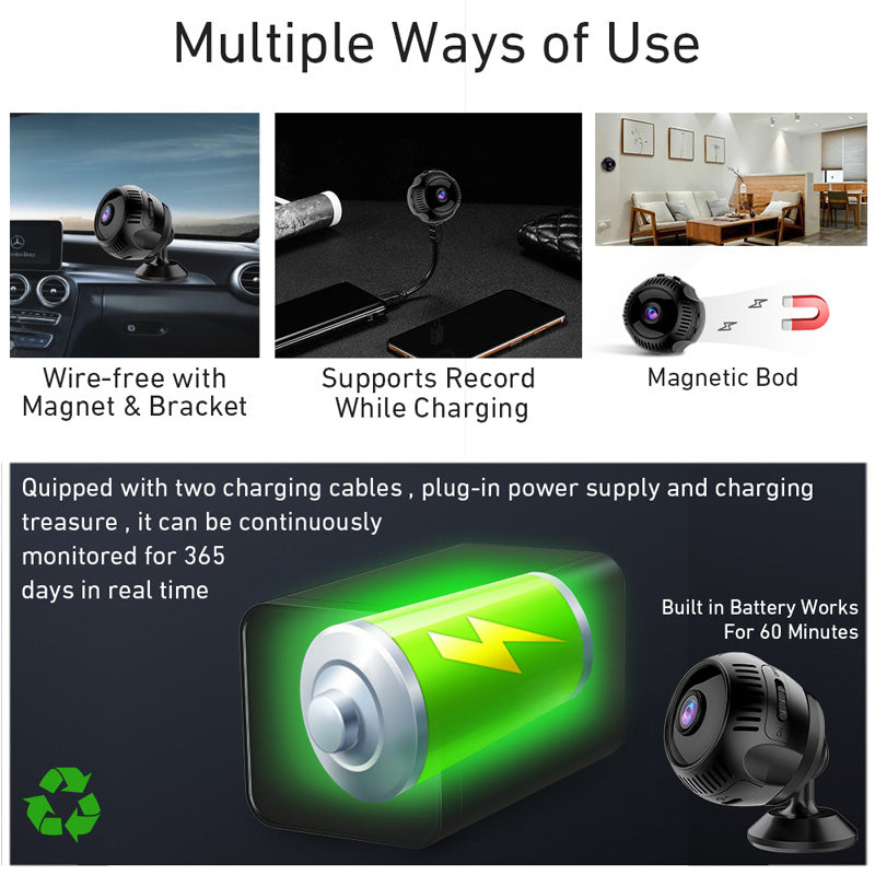 Built-in battery works for 1-2 hours,supports charging and recording at the same time(24/7 recording)