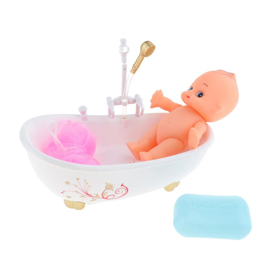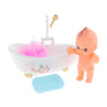 Bathtime Doll Bath Set includes: a real working bathtub with electronic bath sounds, a pretend-play soap, a doll and bath ball
