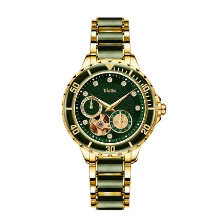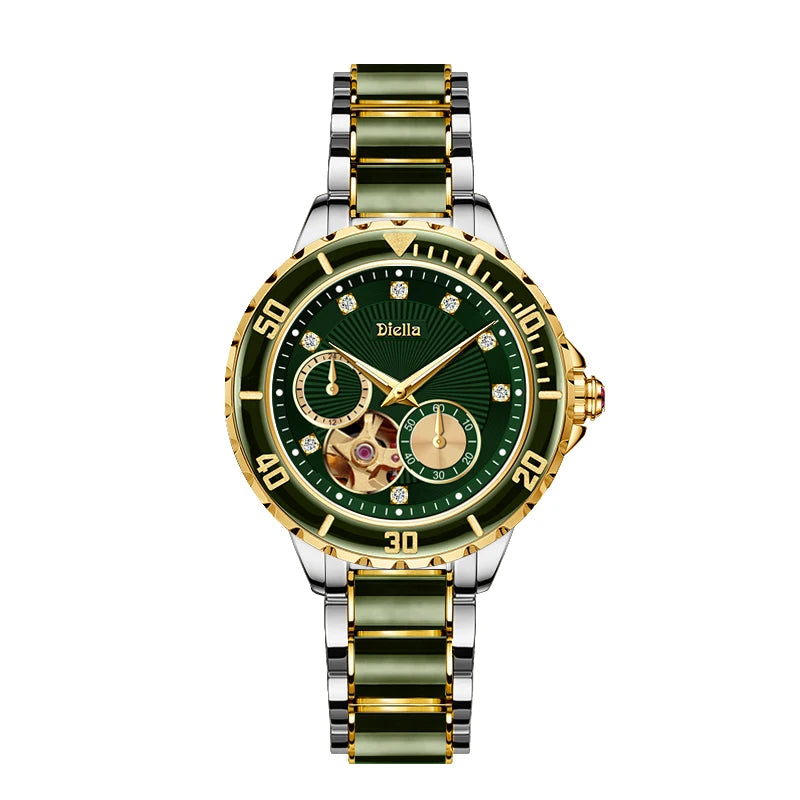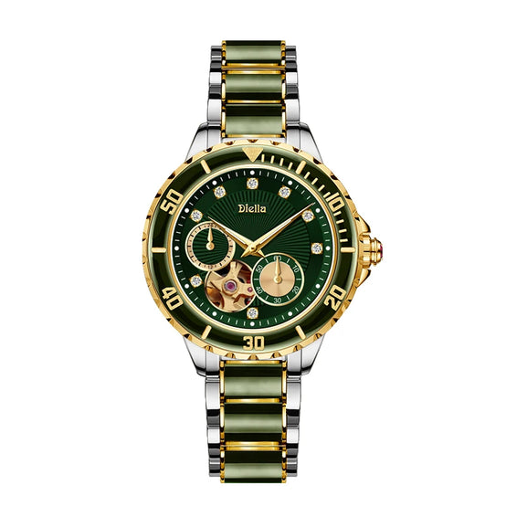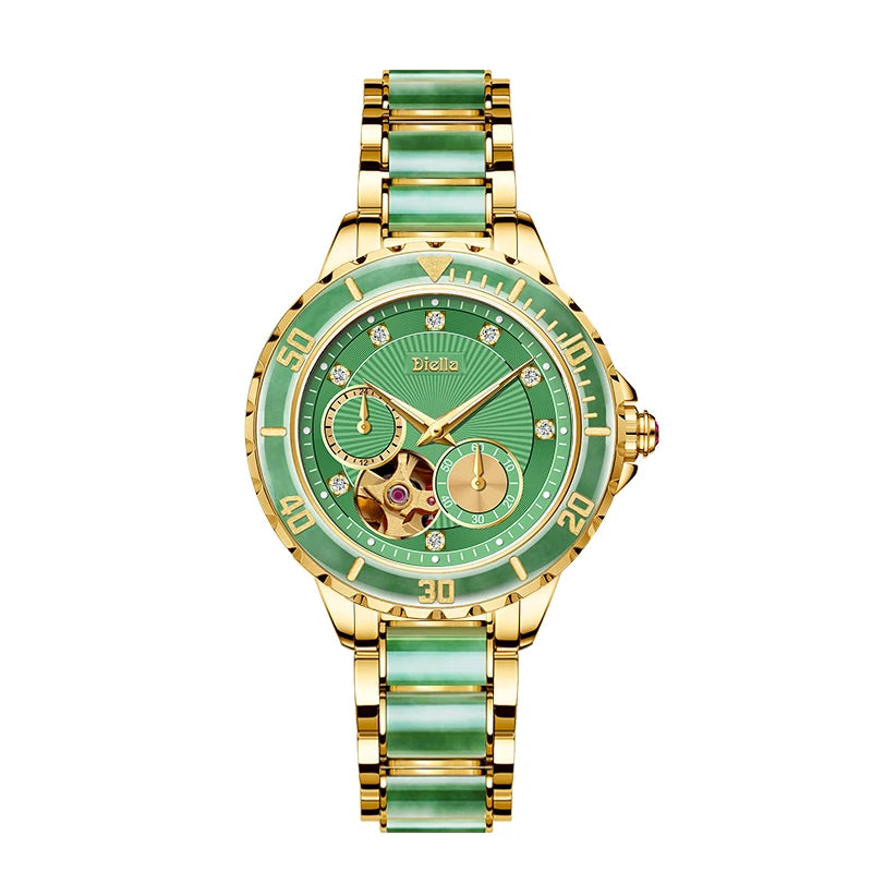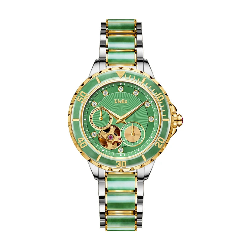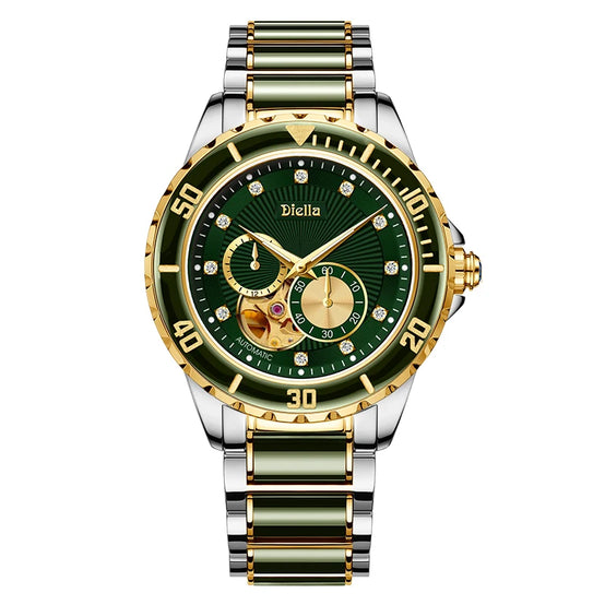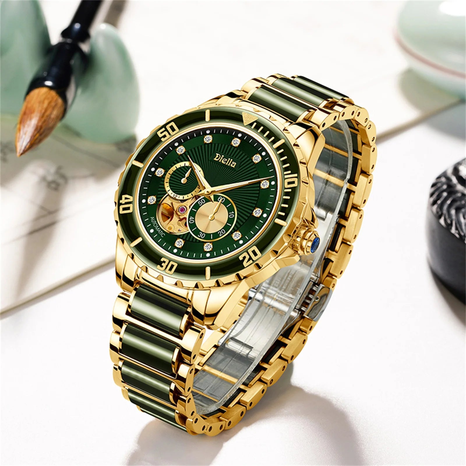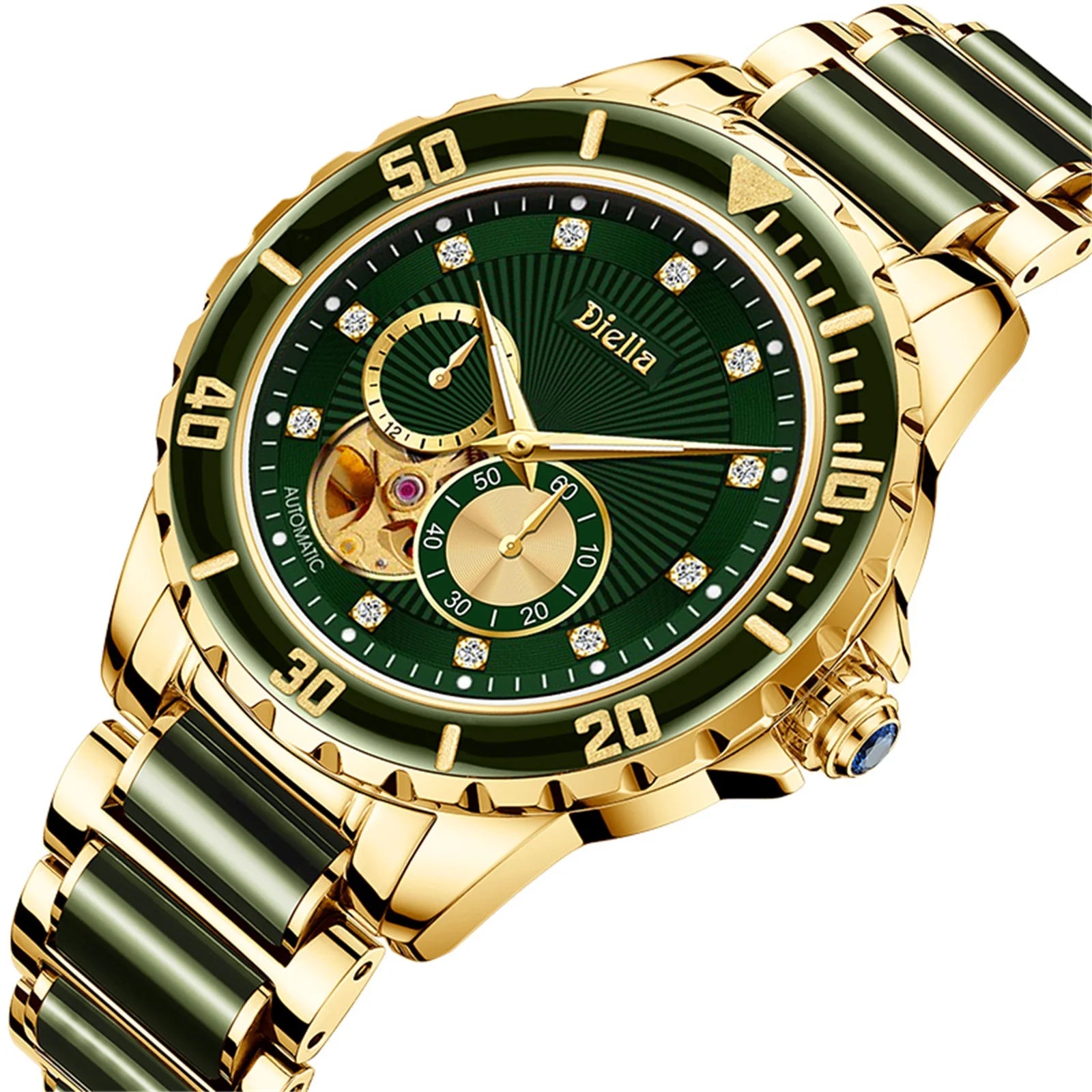 Diellea Men's Mechanical Automatic Jade Gold watch hollow business luxury Sapphire Diamon Couple Pair Watch 6025