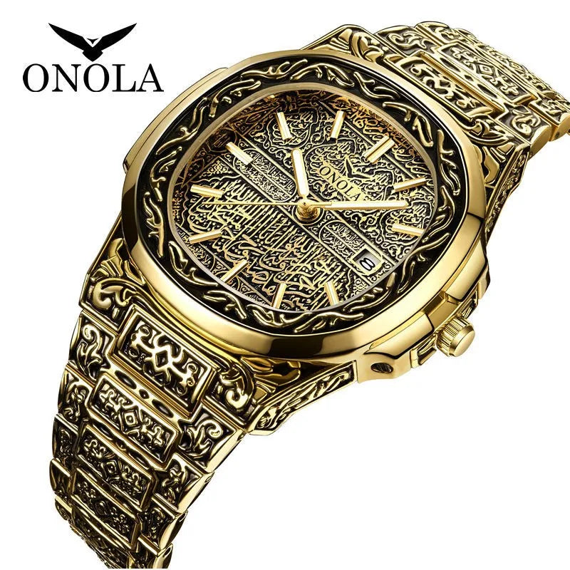 ONOLA 3808 Watches Luxury Vintage Engraved Gold Watch Men Waterproof Quartz Men Business Custom Muslin Watch Azan Wristwatches