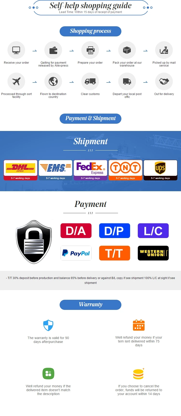 - For OEM or ODM order with custom logo, 50% deposit before production, 50% balance before delivery.