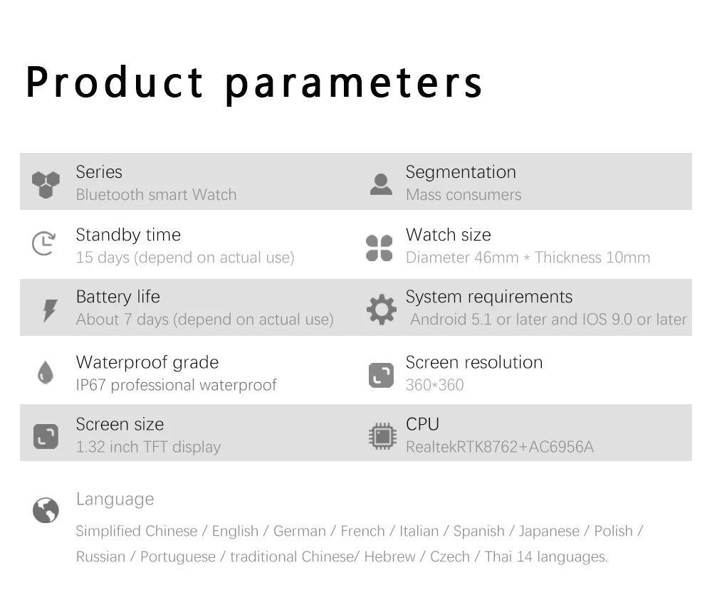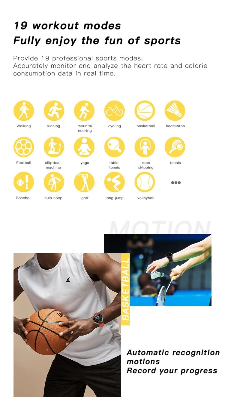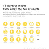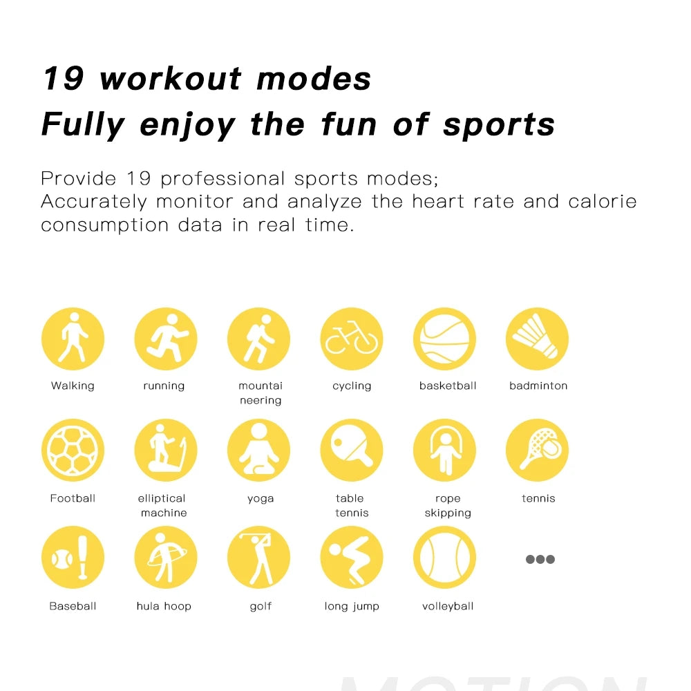 Provide 19 Sport Modes : Walking, Running, Mountain Climbing, Cycling, Basketball, Badminton, Football, Elliptical machine, Yoga, Table tennis, Rope Skipping, Tennis, Baseball, Hula hoop, Golf, Long jump, Volleyball