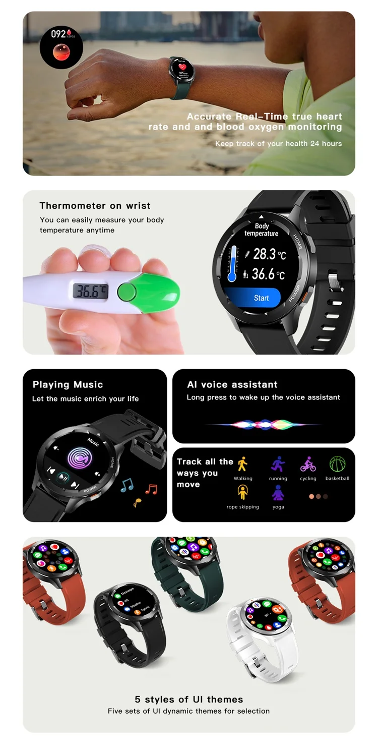 Body temperature, Blood pressure, Sleep Monitor, ECG, Heart Rate Monitor, Intelligent Pedometer, Blood pressure/Oxygen Monitor
