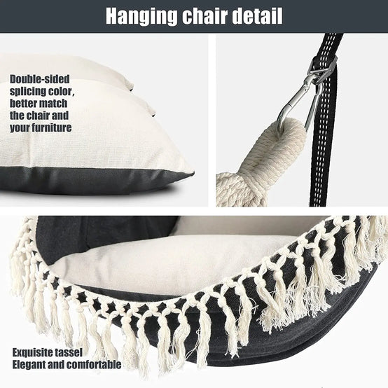 * Extra Bonuses & Additions.There’s a great 10” x 8” inch pocket on the inside providing the perfect space for your book,TV remote, glasses or your chocolate stash.The large 2 cushions,17.7” x 17.7” will give you extra support.The chair is enhanced by the beautiful macrame trim,looks amazing.A drawstring bag to store and portable.A hook and a rope for hanging,it is easy to set up.This is the best hanging chair for bedrooms and outdoors.