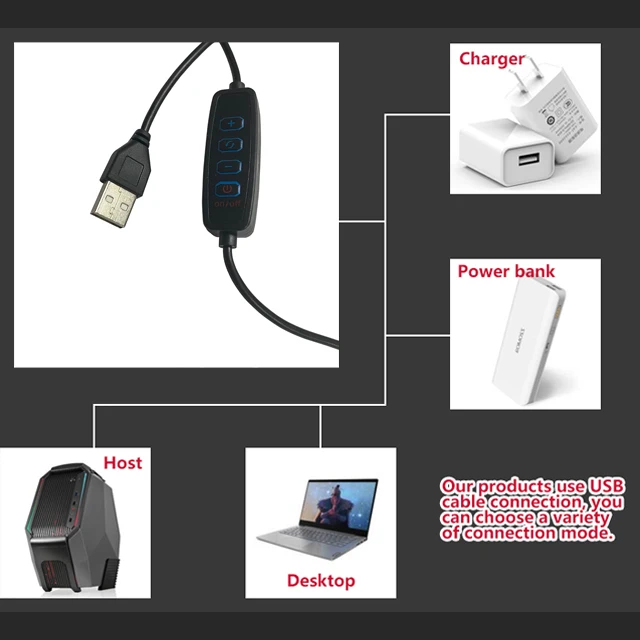 4)【USB Powered】Works with most devices that support USB port, like laptop, PC, power bank, USB charger, AC adapter, and etc. There are four buttons on cords to power on/off, switch the lighting mode, and adjust brightness levels, it is easy to find your preferred options in seconds.